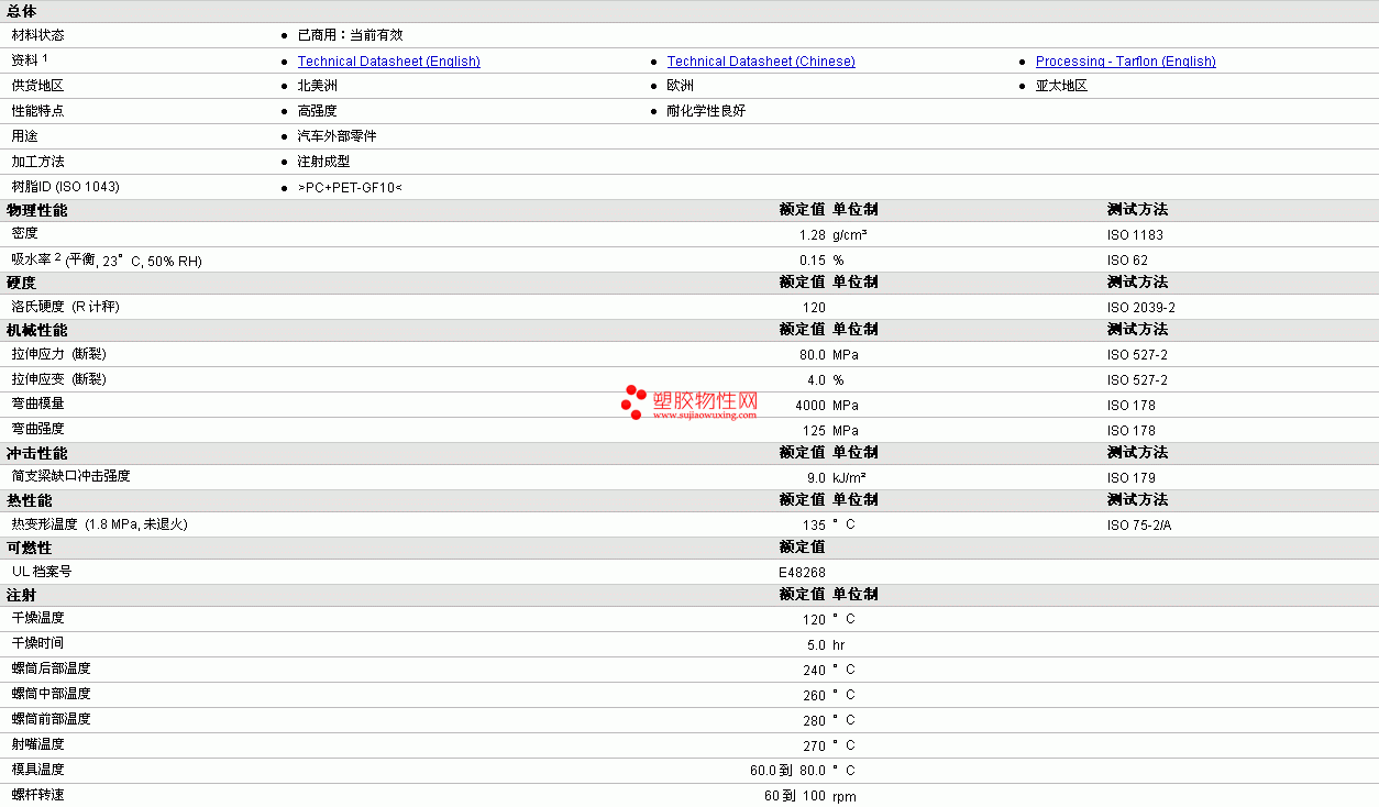 Tarflon PC/PET SC-300G10物性表详细情况如图