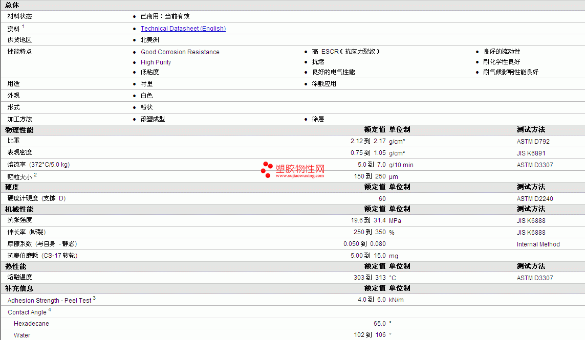 | 熔流率 (372°C/5.0 kg) | 5.0 到 7.0 | g/10 min | ASTM D3307 |