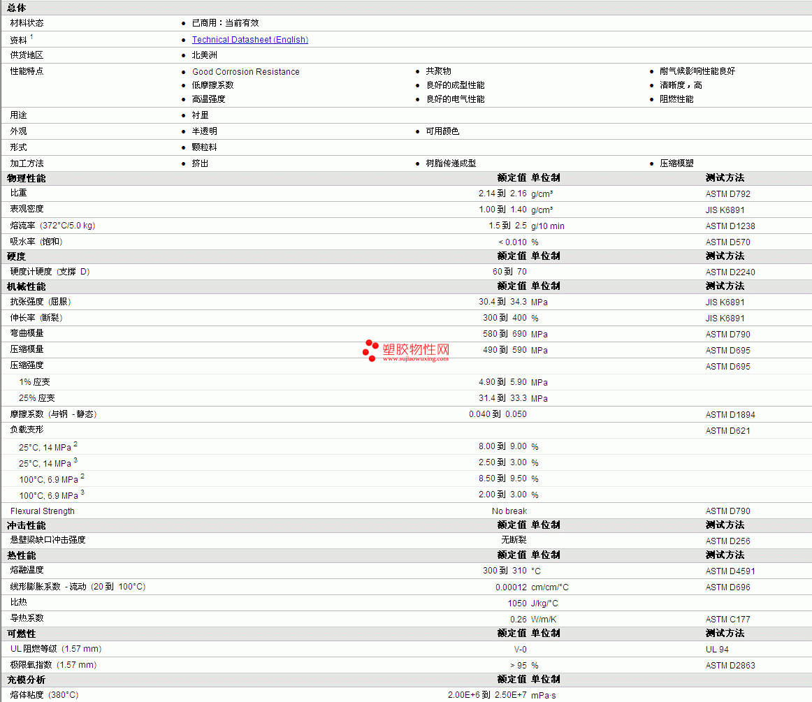 | 熔流率 (372°C/5.0 kg) | 1.5 到 2.5 | g/10 min | ASTM D1238 |