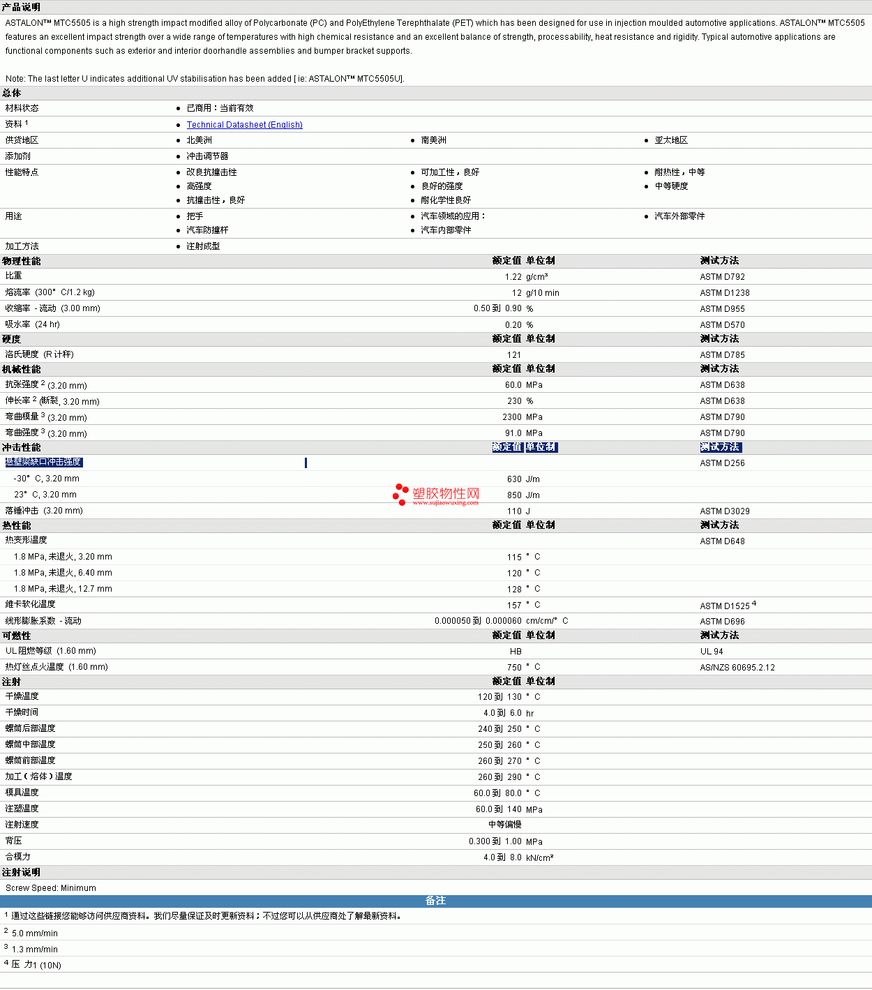 ASTALON PC/PBT MTC5505物性表详细情况如图