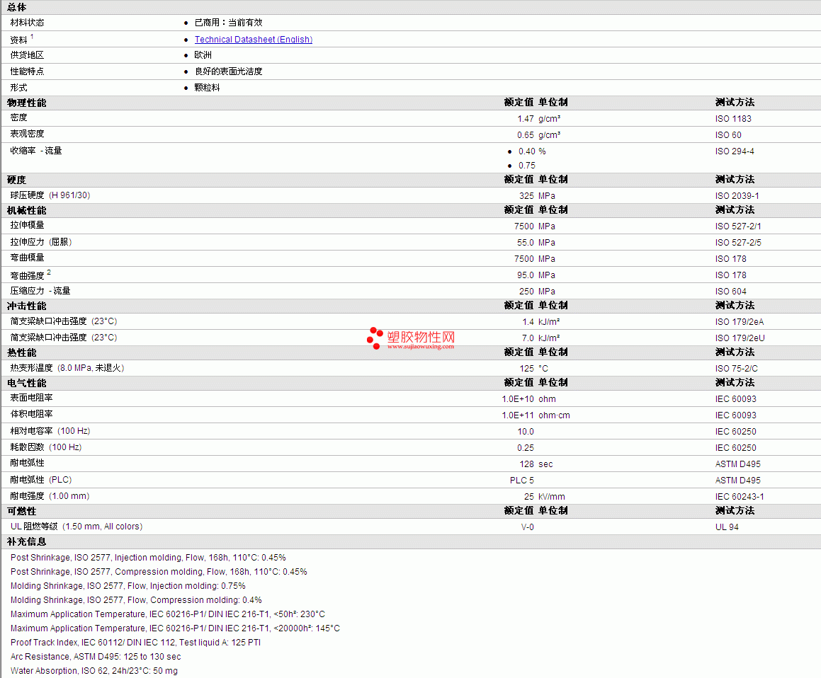 | 拉伸模量 | 7500 | MPa | ISO 527-2/1 |