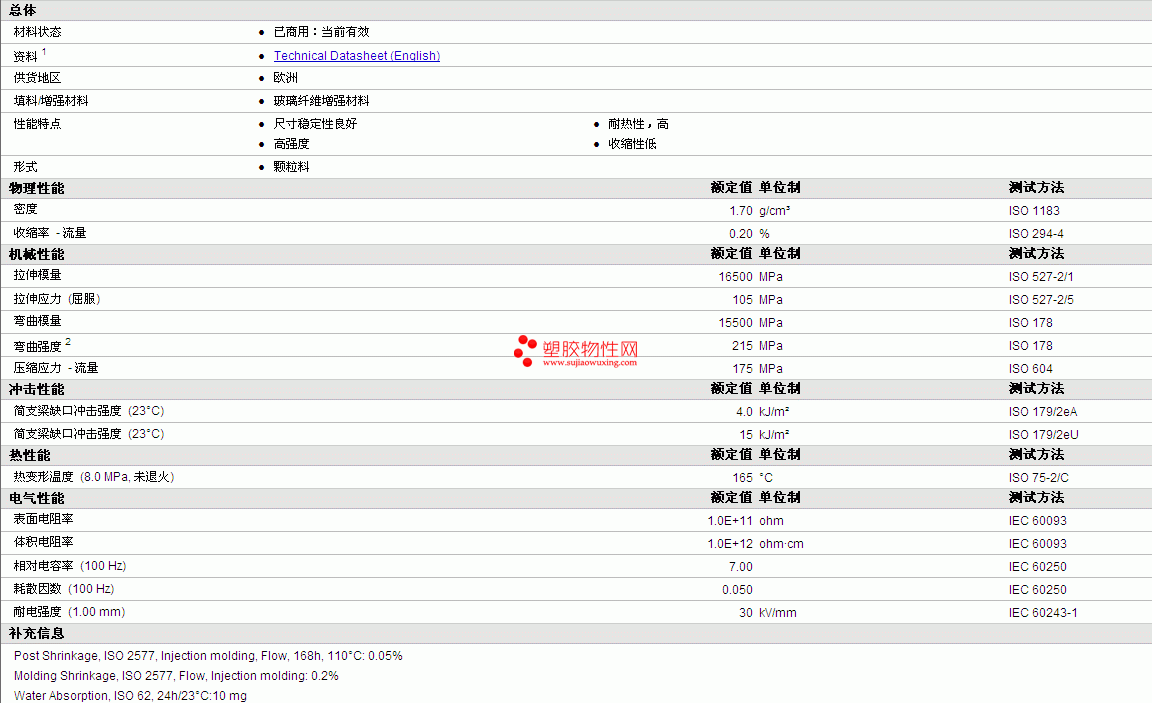 | 弯曲模量 | 15500 | MPa | ISO 178 |