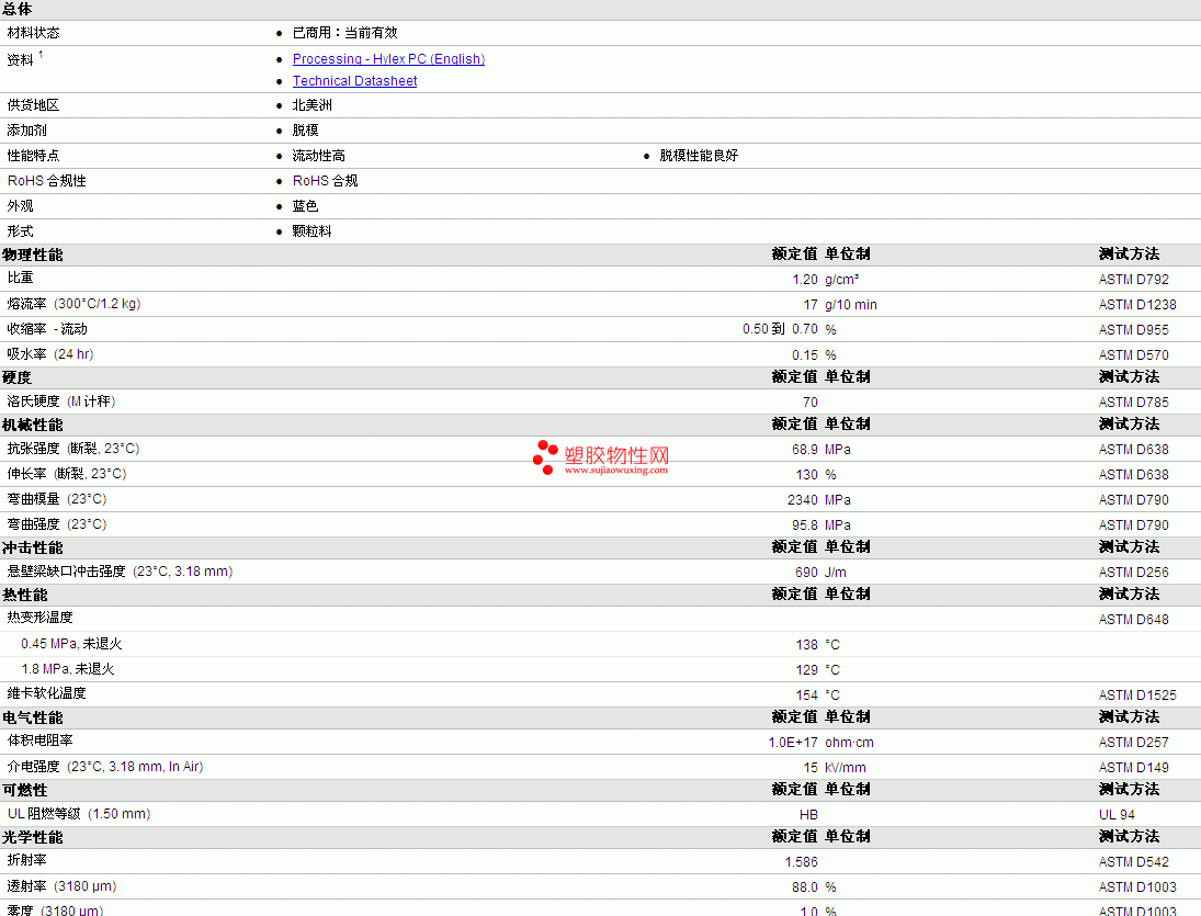 Hylex PC P1017L 2HB 物性表 如图