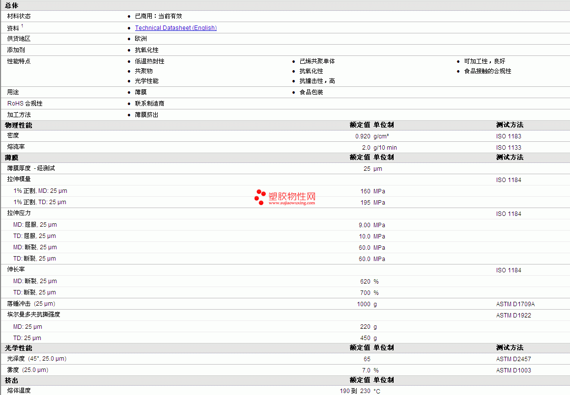 | 密度 | 0.920 | g/cm³ | ISO 1183 |