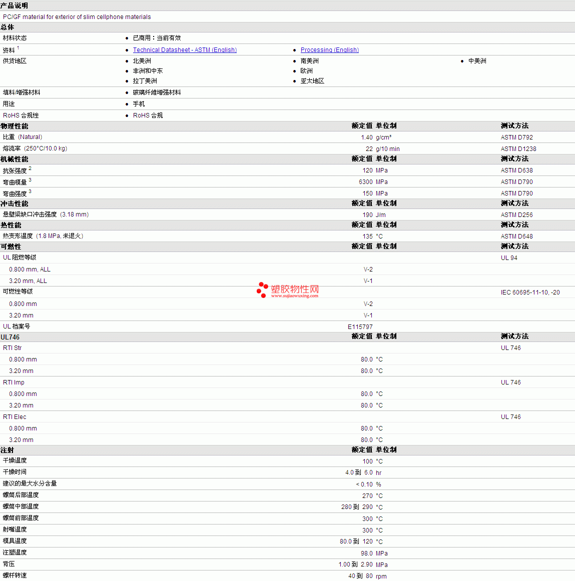 | 机械性能 | 额定值 | 单位制 | 测试方法 |