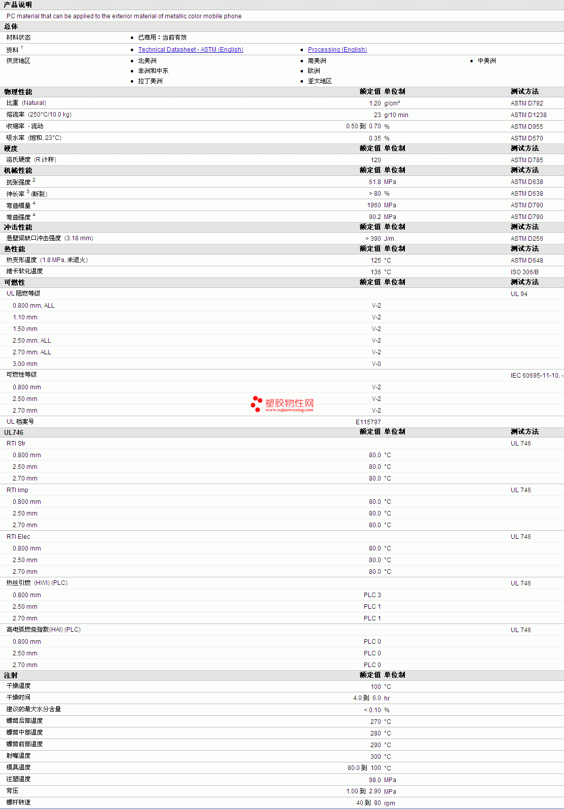 | 收缩率 - 流动 | 0.50 到 0.70 | % | ASTM D955 |