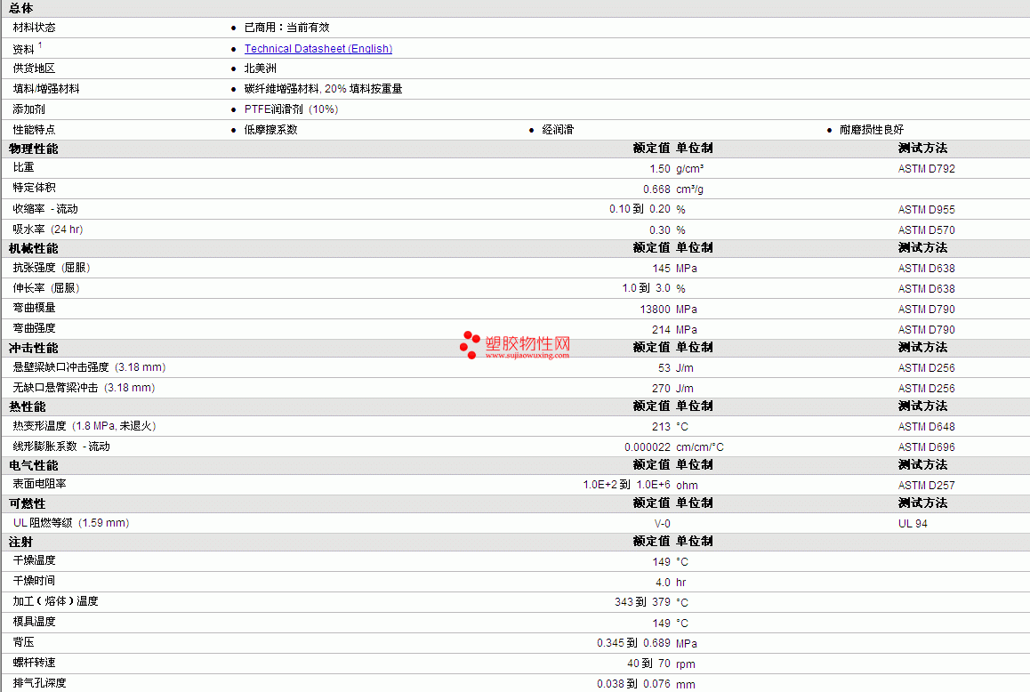 | 收缩率 - 流动 | 0.10 到 0.20 | % | ASTM D955 |