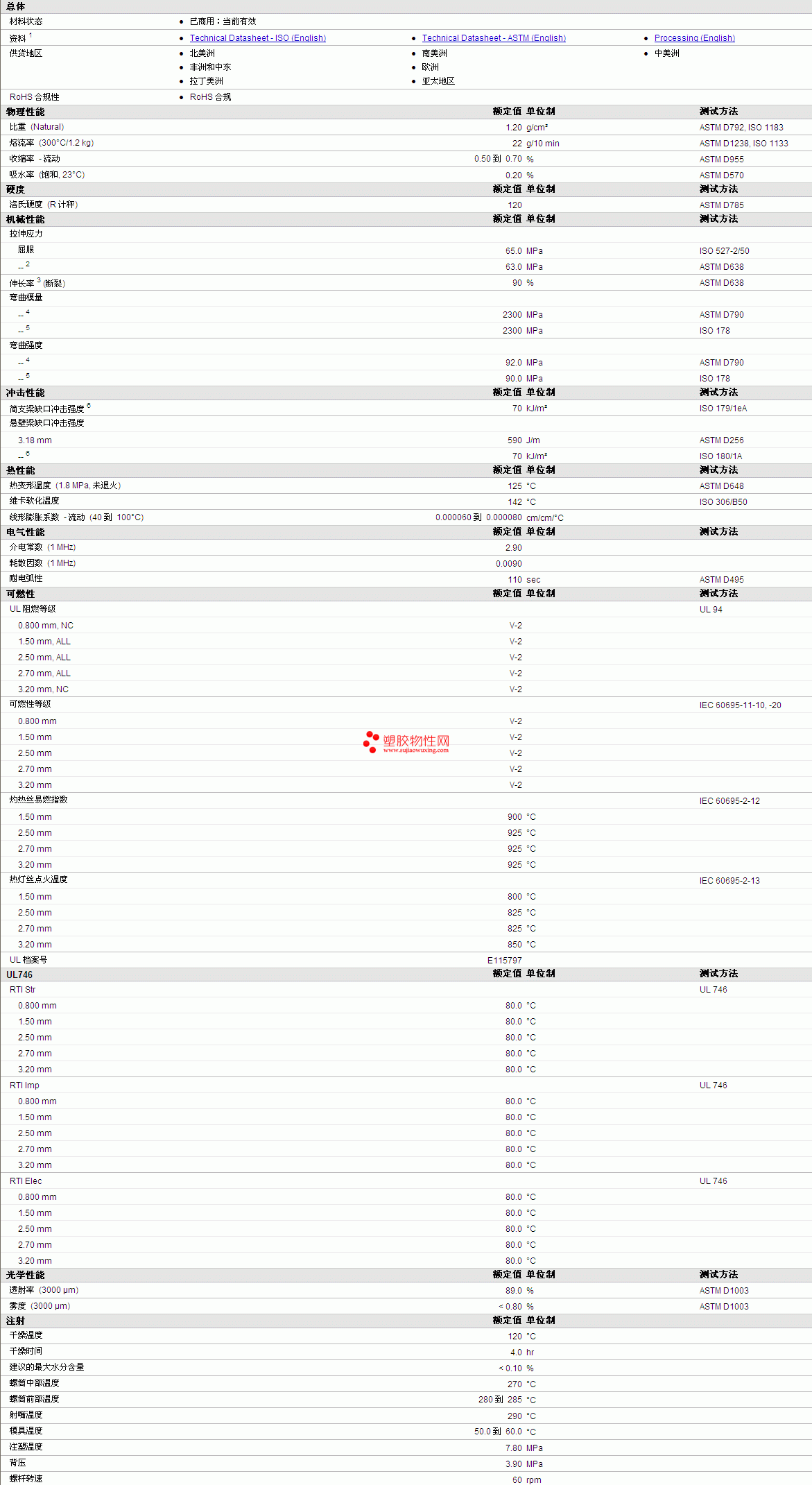 | 收缩率 - 流动 | 0.50 到 0.70 | % | ASTM D955 |