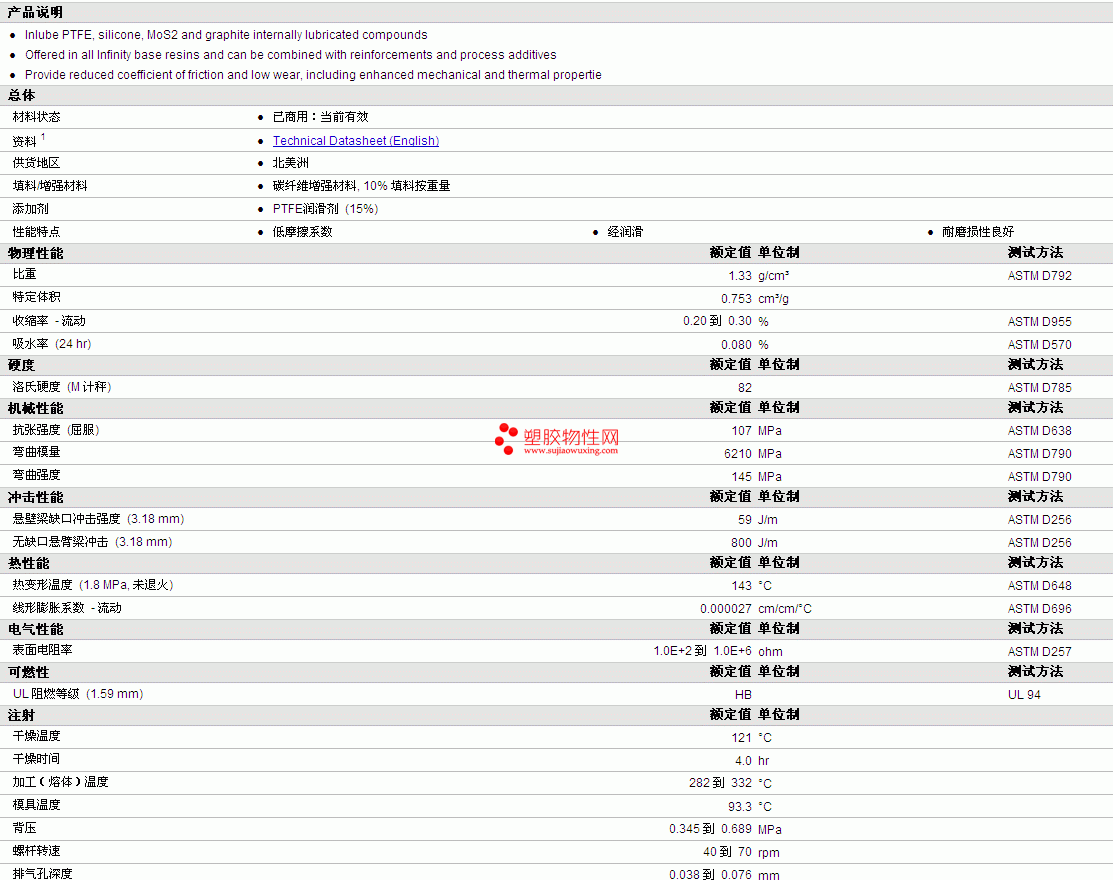 如需INLUBE PC CF10TF15塑料更多详情,其他塑胶原料物性尽在塑胶物性网,致电咨询或QQ:767320520