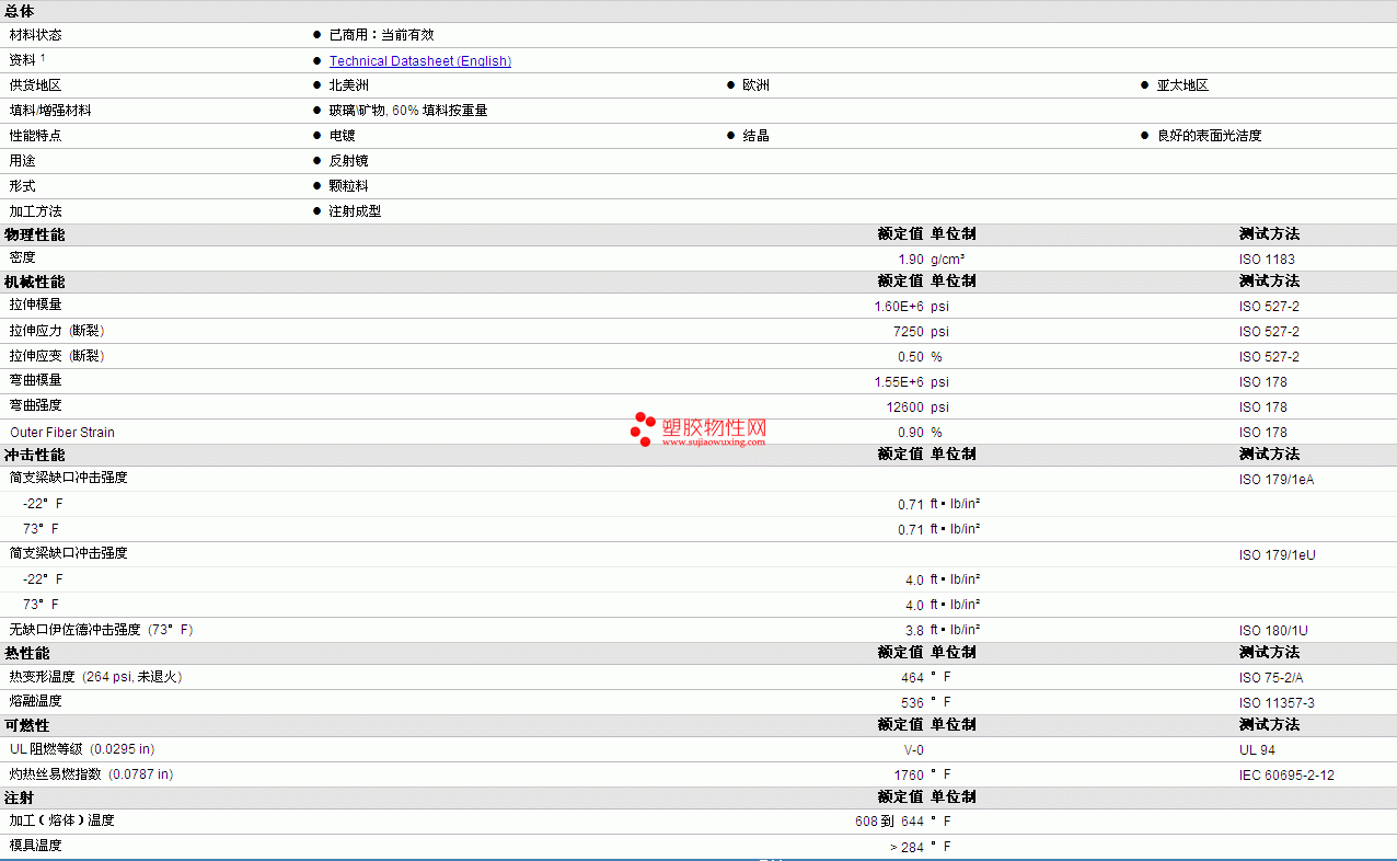 | 拉伸模量 | 1.60E+6 | psi | ISO 527-2 |