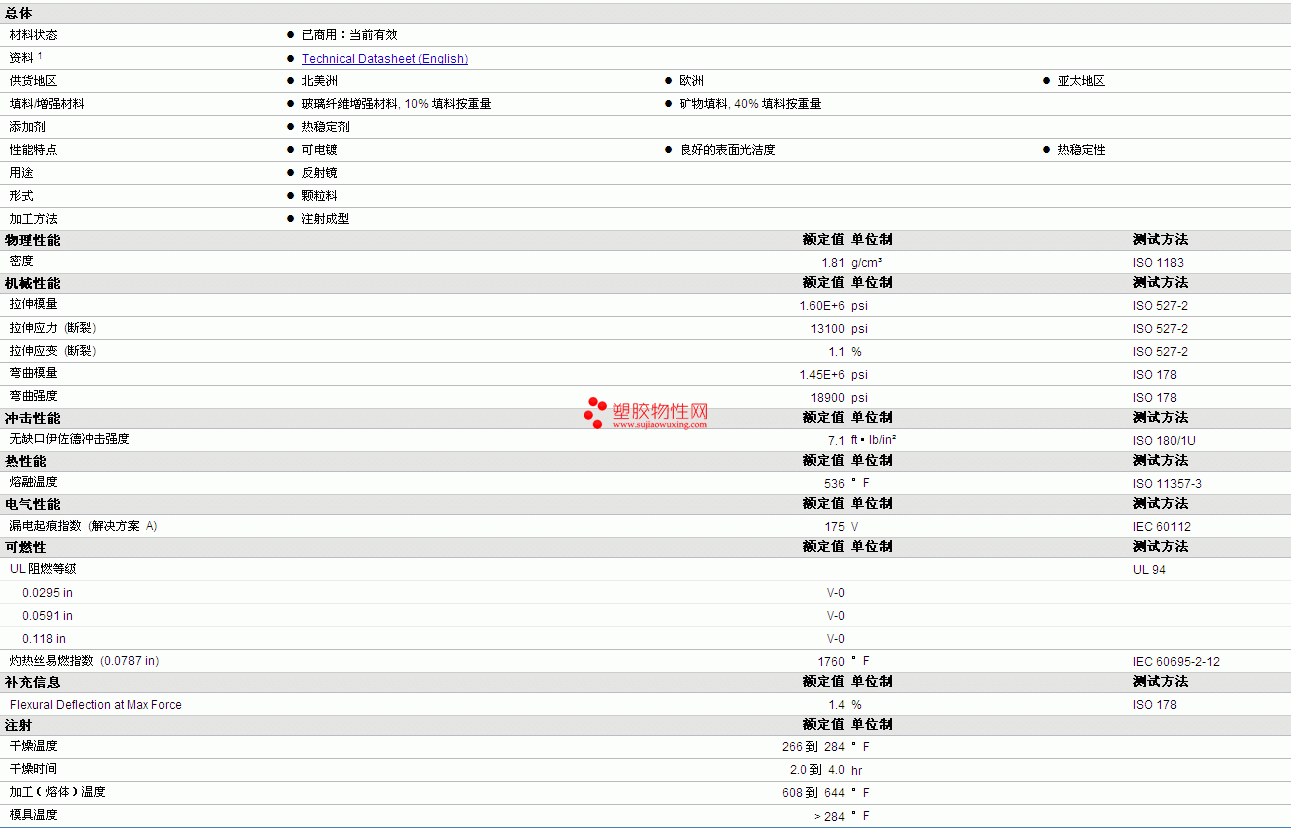 | 拉伸模量 | 1.60E+6 | psi | ISO 527-2 |