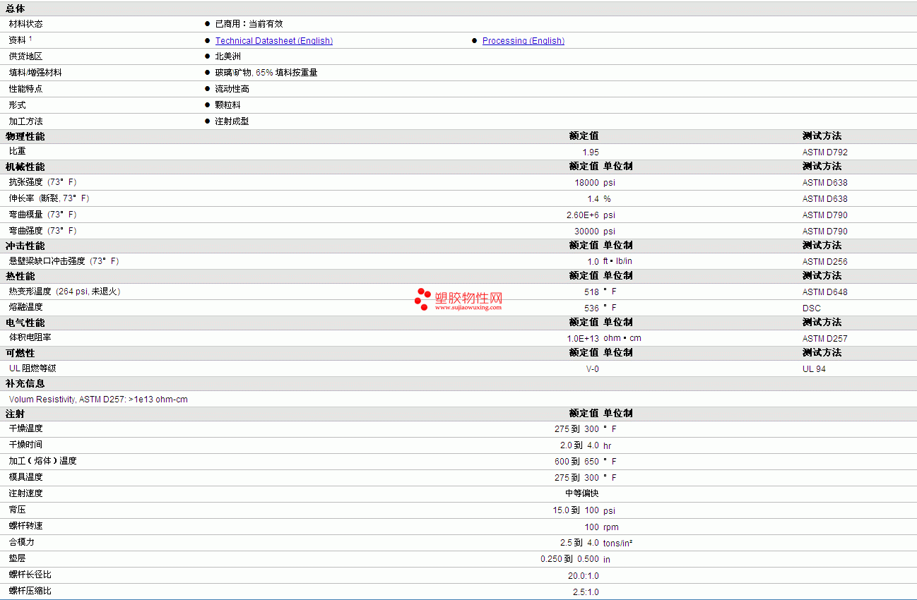 | 弯曲模量 (73°F) | 2.60E+6 | psi | ASTM D790 |