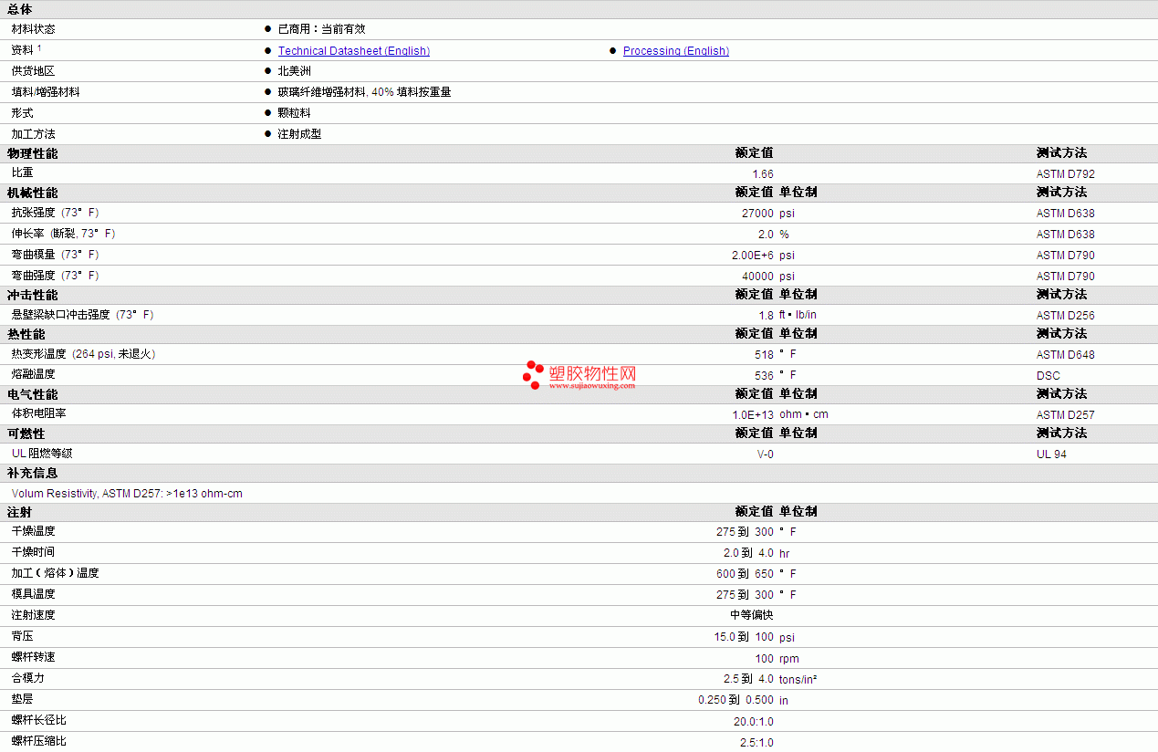 | 弯曲强度 (73°F) | 40000 | psi | ASTM D790 |