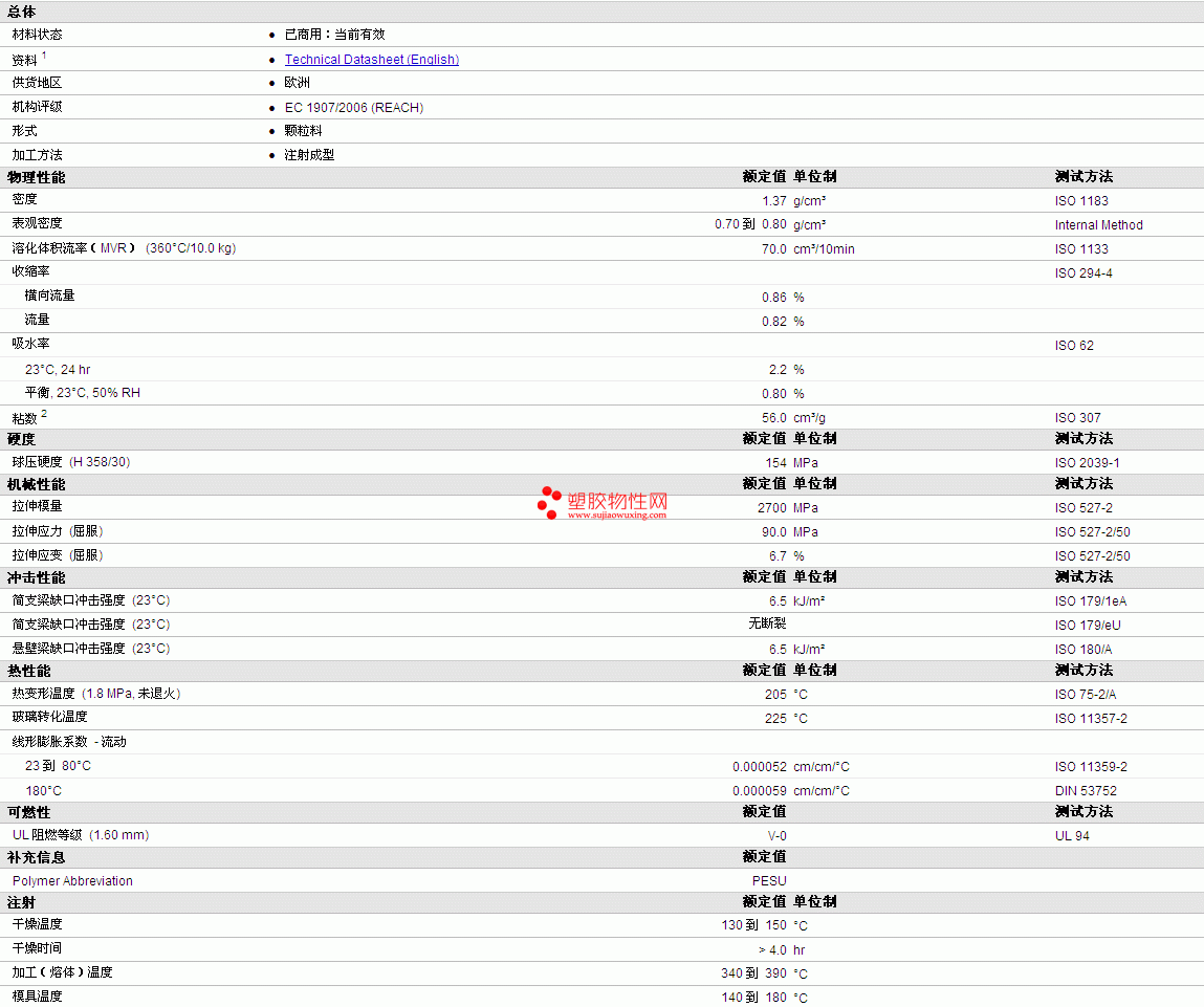 | 溶化体积流率(MVR) (360°C/10.0 kg) | 70.0 | cm³/10min | ISO 1133 |