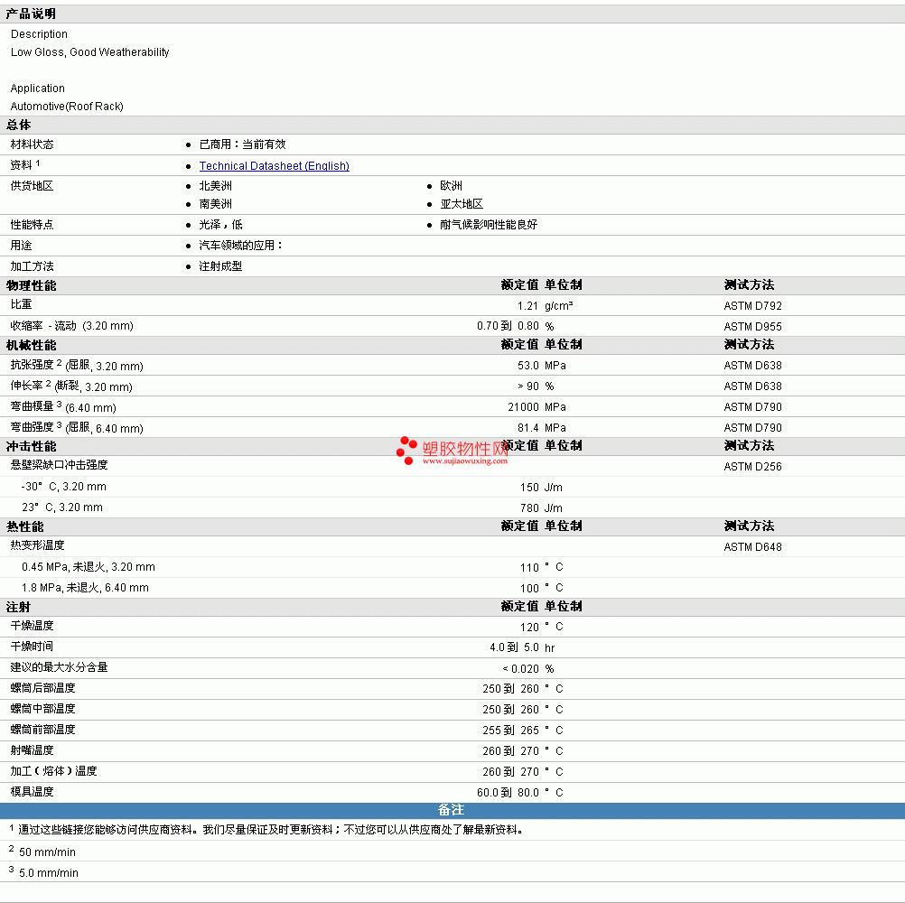 | 收缩率 - 流动 (3.20 mm) | 0.70 到 0.80 | % | ASTM D955 |