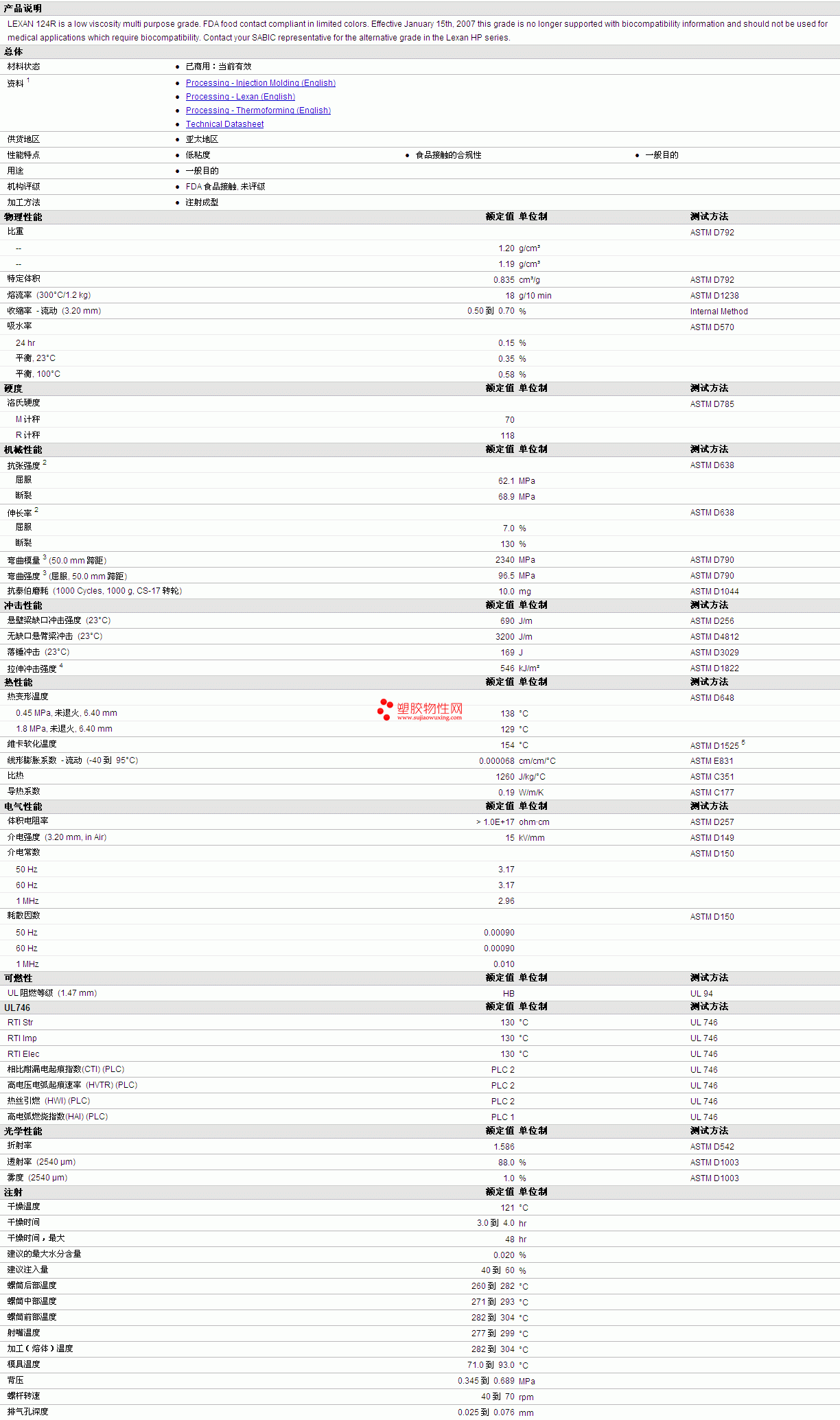 更多LEXAN PC 124R Resin物性表报价,材质证明、UL黄卡、物质安全资料表(MSDS)、报价、等可来电咨询或QQ:767320520