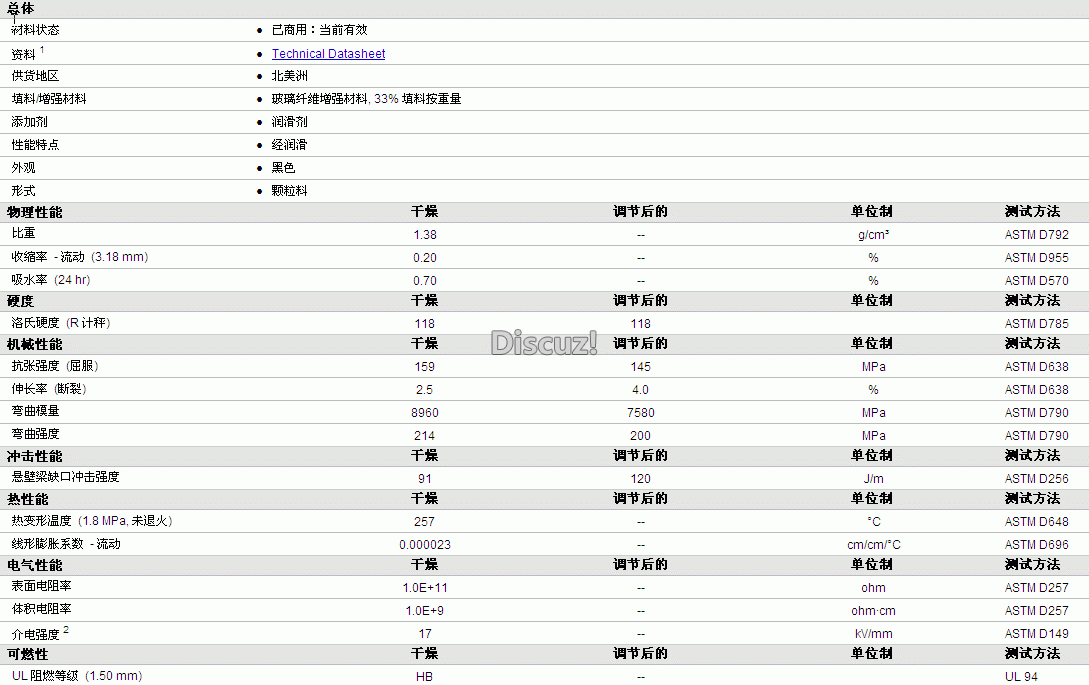HiFill PA6/6 GF33 BK024物性表详情如图所示
