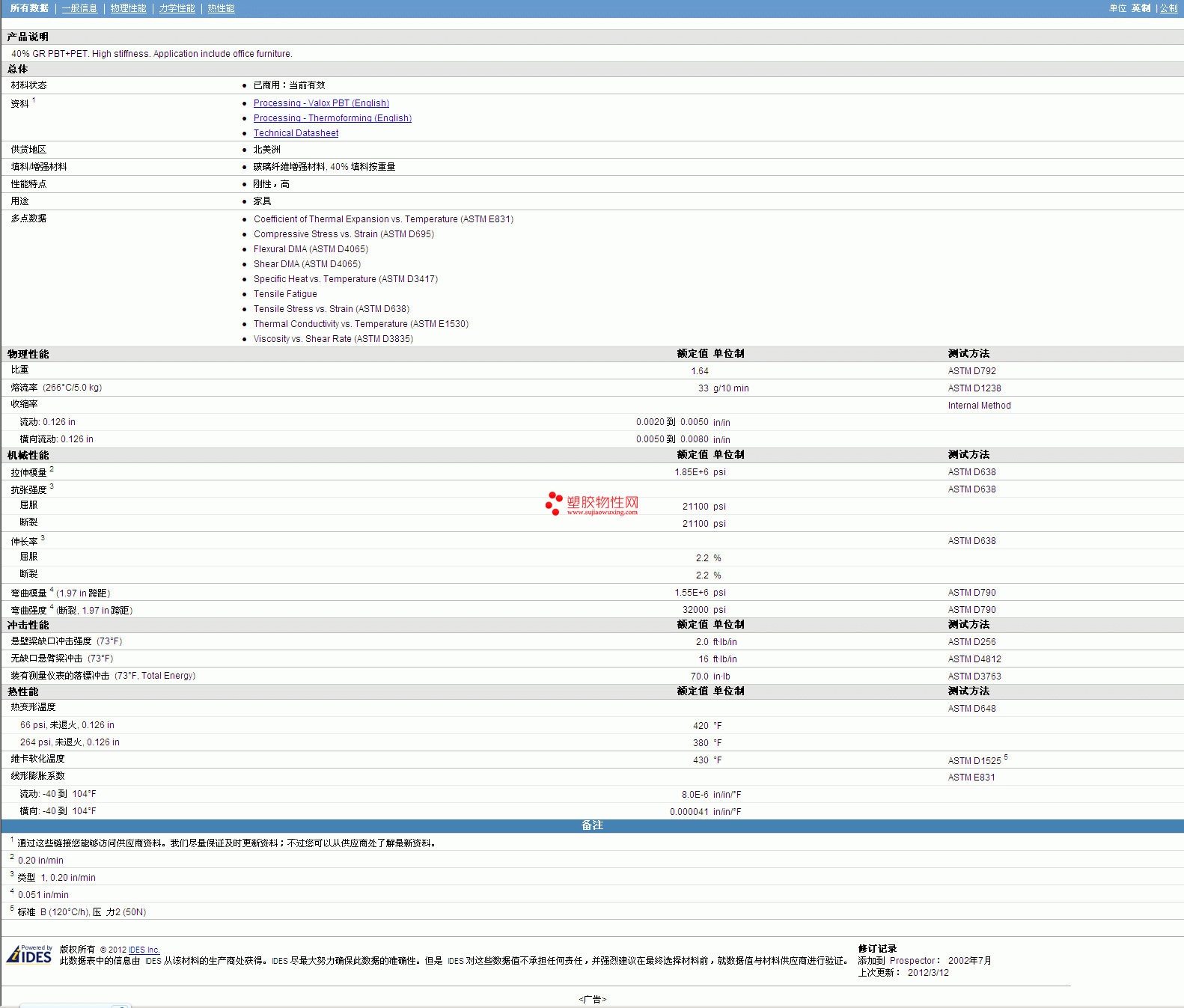 需了解VALOX PBT/PET V4280 Resin 物性表更多详情,材质证明、ROHS(SGS)报告、物质安全资料表(MSDS)、UL黄卡等,最新行情报价等可来电咨询:赵先生:13424755533或QQ: 27660005