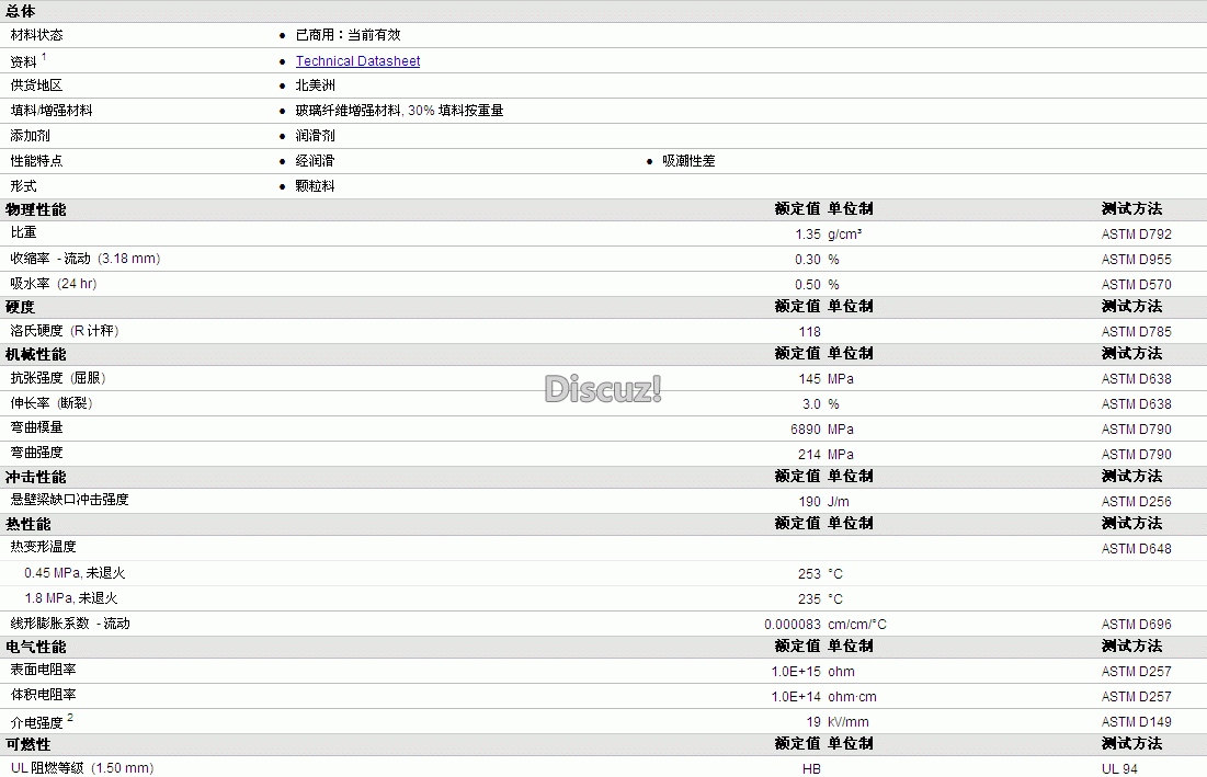 HiFill PA6/6 GF30 RM-1 L物性表详情如图所示
