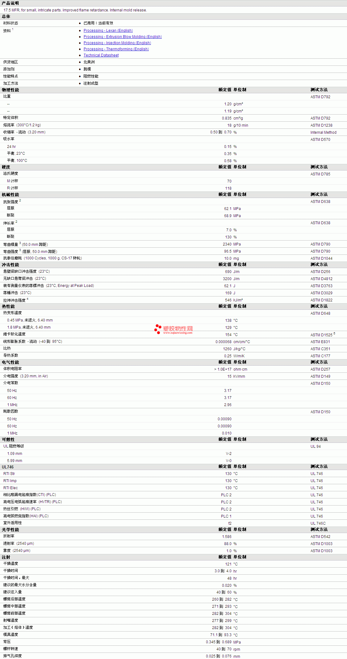 LEXAN PC 221R Resin 物性表如图