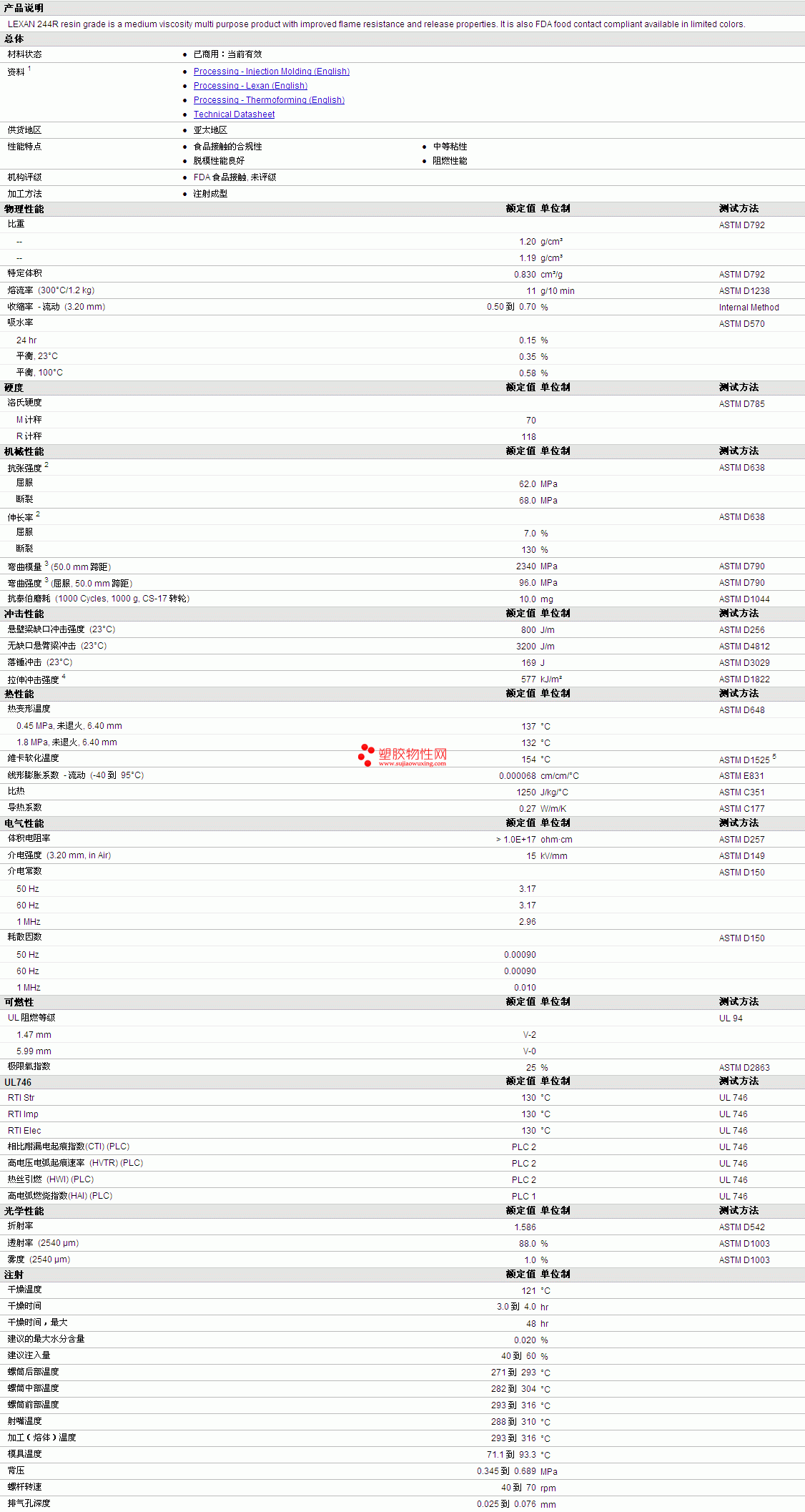 更多LEXAN PC 244R Resin材质证明、UL黄卡、物质安全资料表(MSDS)、报价、等可来电咨询或QQ:767320520