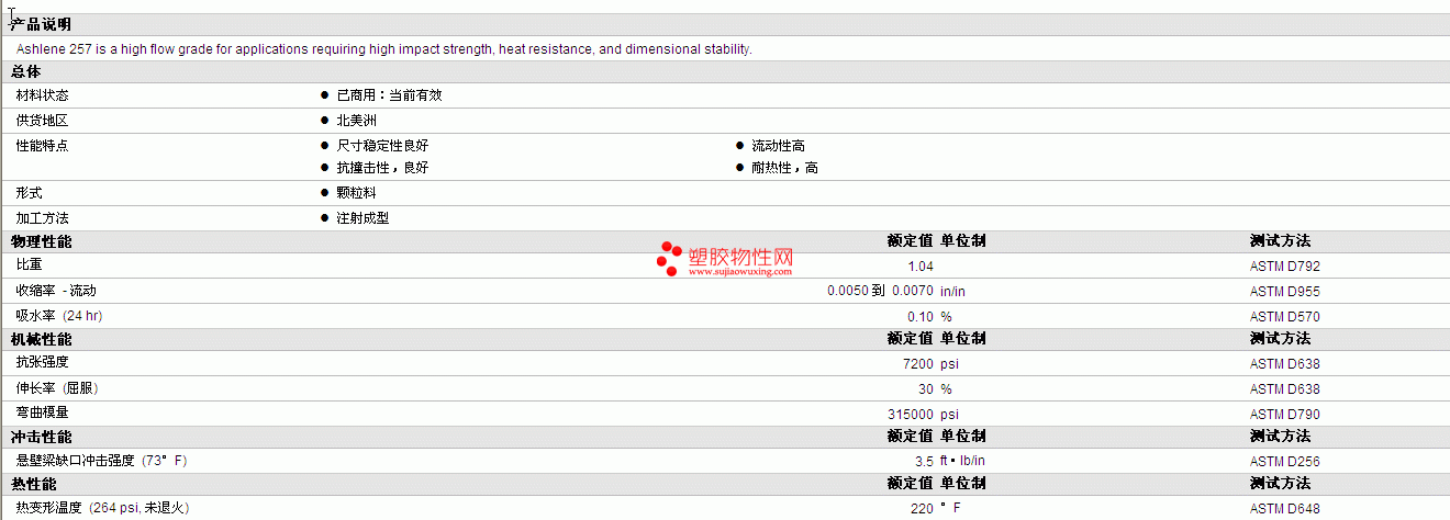 | 收缩率 - 流动 | 0.0050 到 0.0070 | in/in | ASTM D955 |