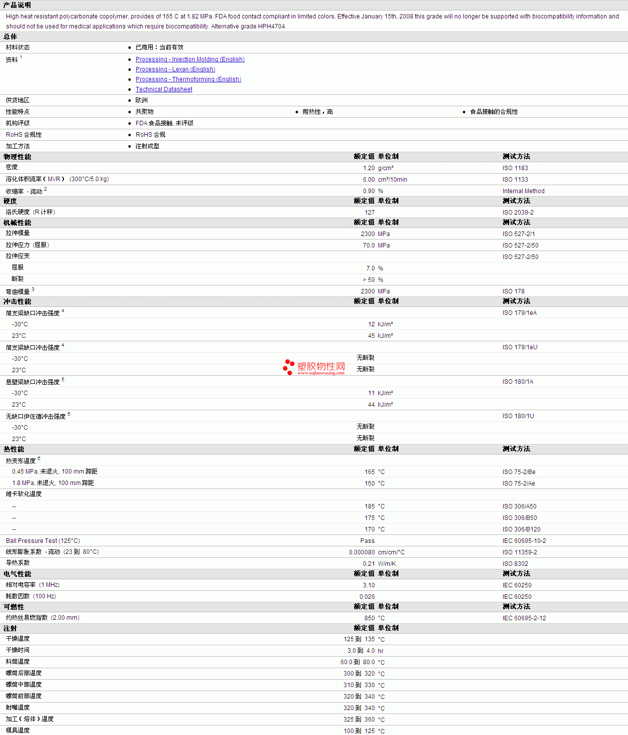 LEXAN PC 4704 Resin物性表详细情况如图