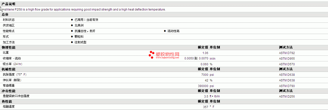 | 收缩率 - 流动 | 0.0050 到 0.0070 | in/in | ASTM D955 |