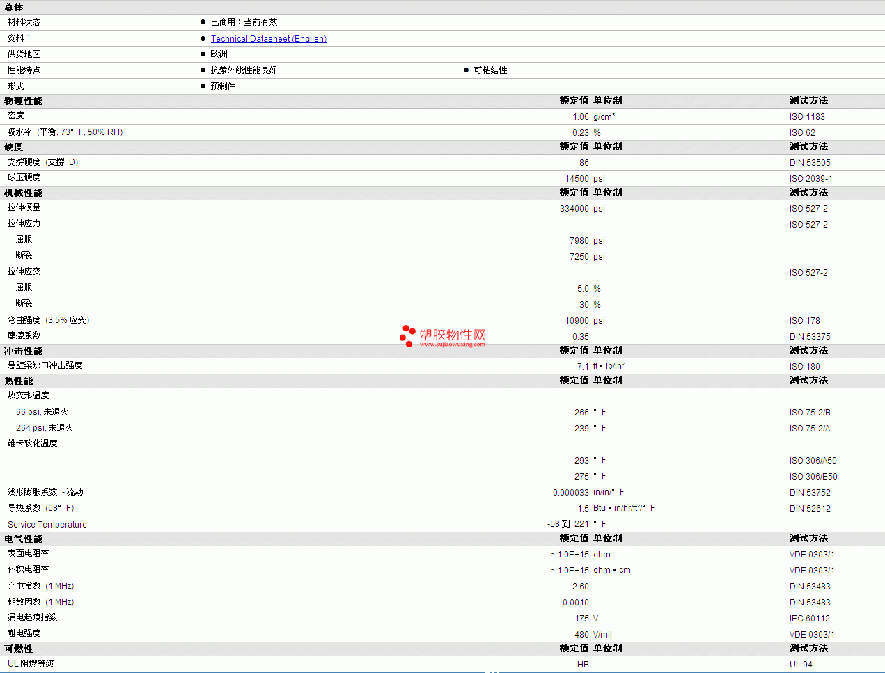 | 拉伸模量 | 334000 | psi | ISO 527-2 |