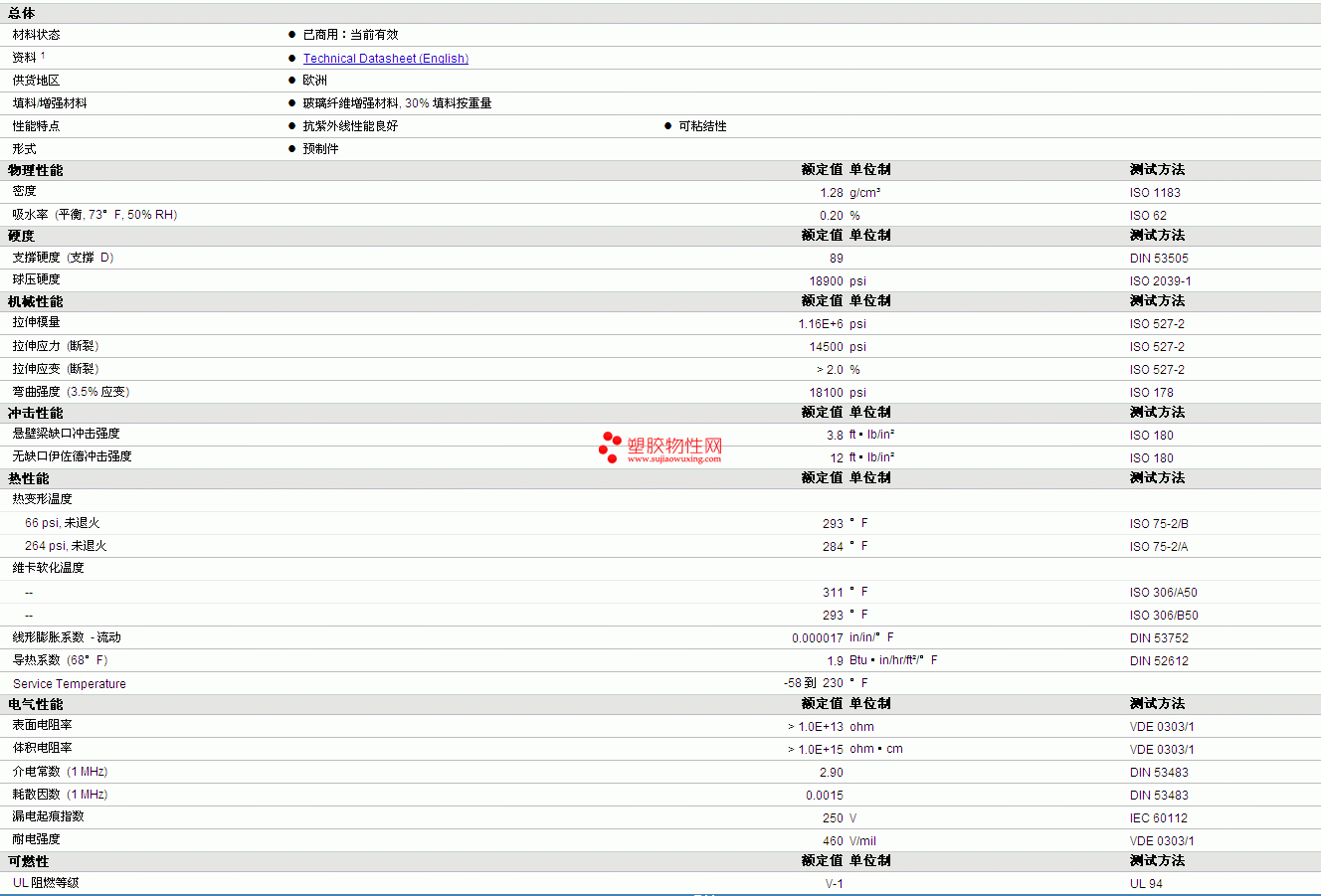 | 拉伸模量 | 1.16E+6 | psi | ISO 527-2 |