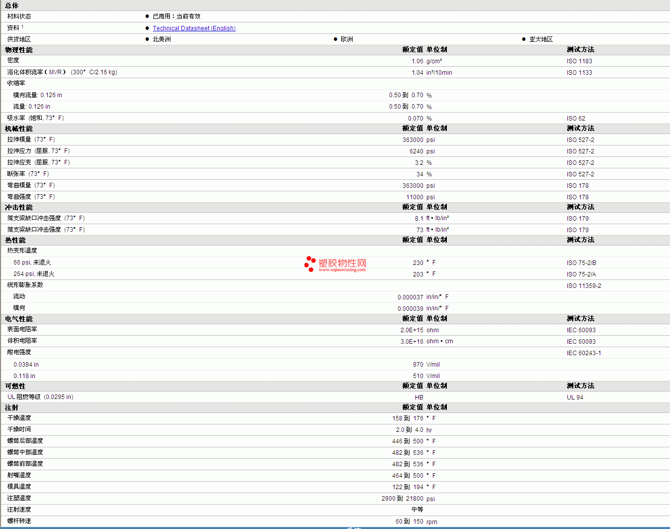 | 溶化体积流率(MVR) (300°C/2.16 kg) | 1.04 | in³/10min | ISO 1133 |