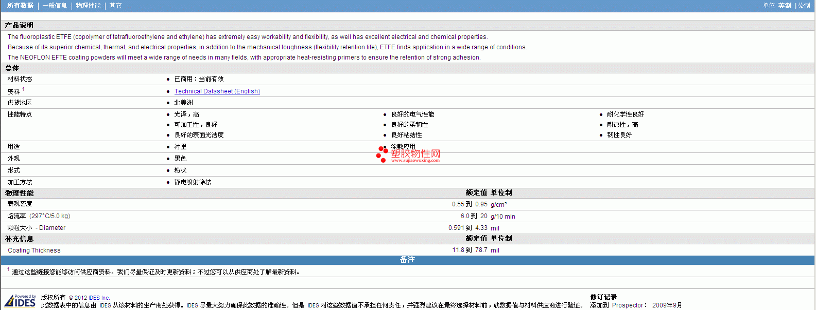 更多NEOFLON ETFE EC-6519物性表报价,图片、材质证明、UL黄卡、物质安全资料表(MSDS)等可来电咨询赵先生:13424755533或QQ: 27660005