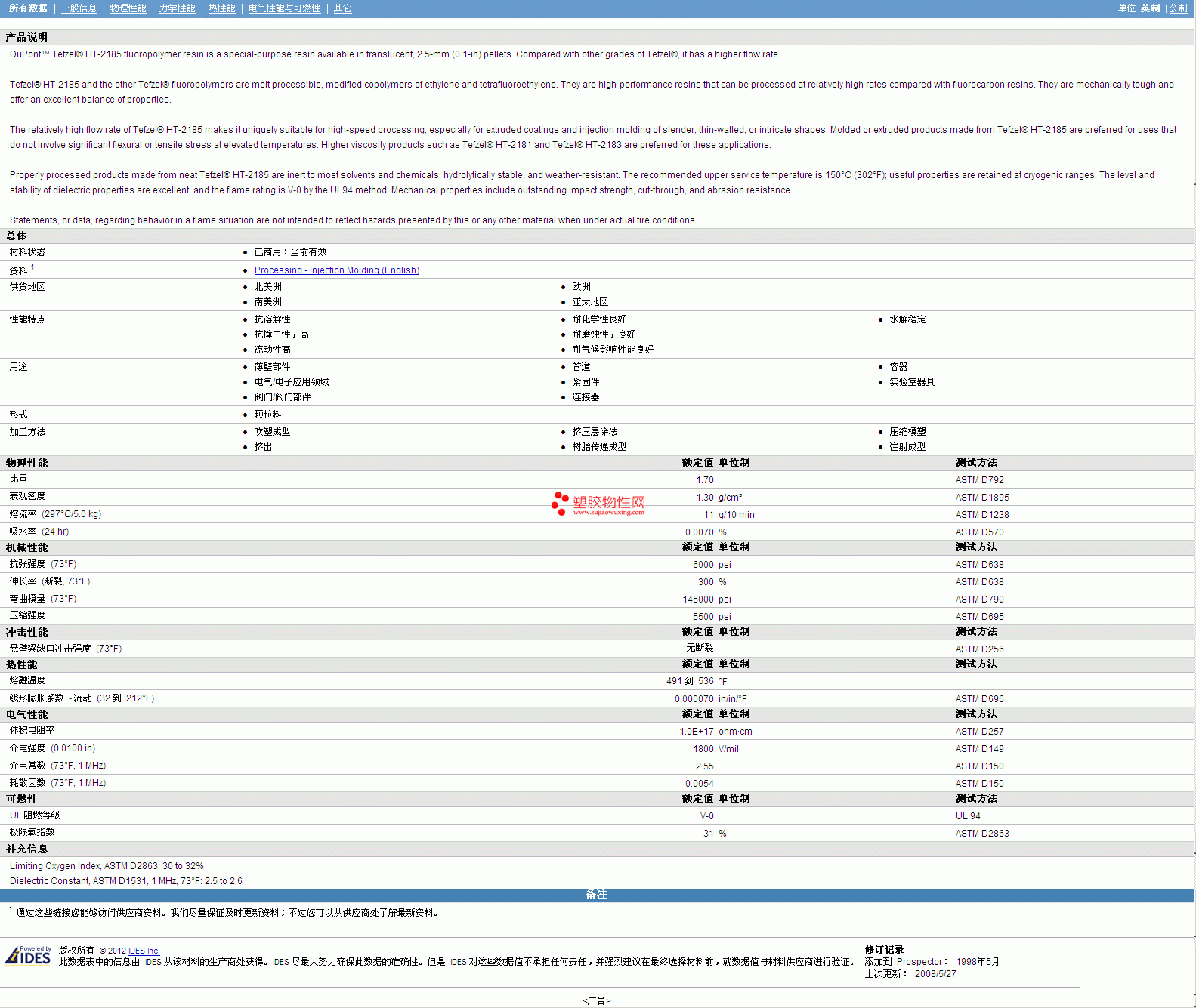 更多Tefzel ETFE HT-2185物性表报价,图片、材质证明、UL黄卡、物质安全资料表(MSDS)等可来电咨询赵先生:13424755533或QQ: 27660005