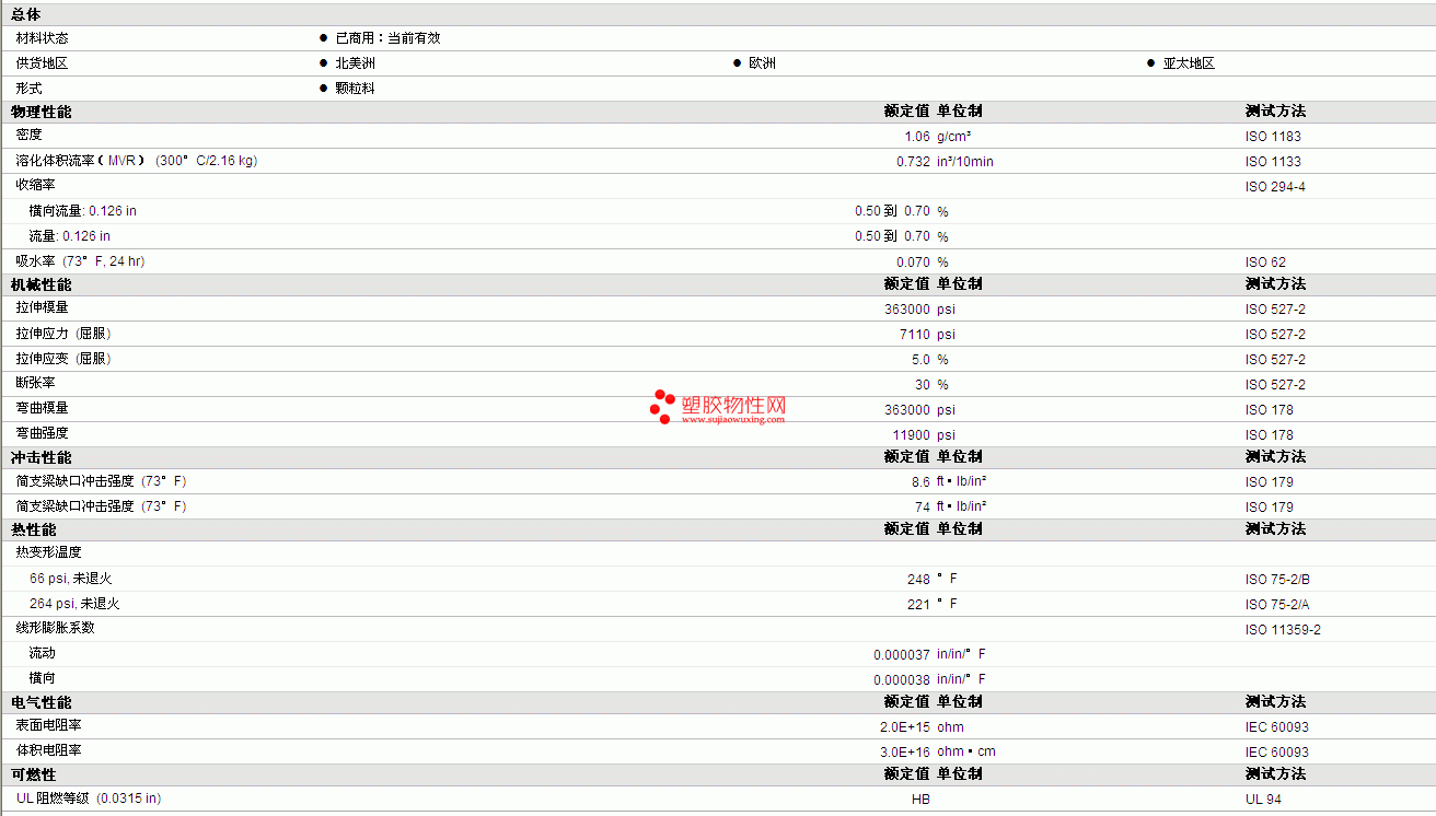 | 拉伸模量 | 363000 | psi | ISO 527-2 |