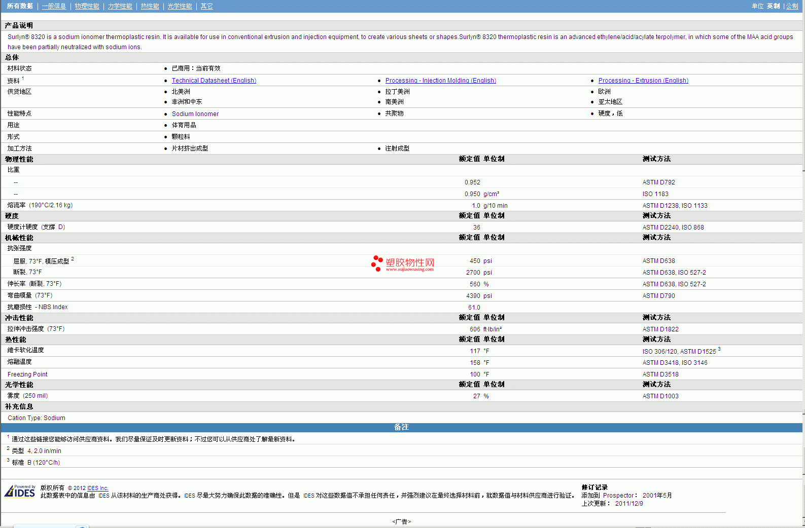 更多Surlyn EMAA 8320物性表报价,图片、材质证明、UL黄卡、物质安全资料表(MSDS)等可来电咨询赵先生:13424755533或QQ: 27660005