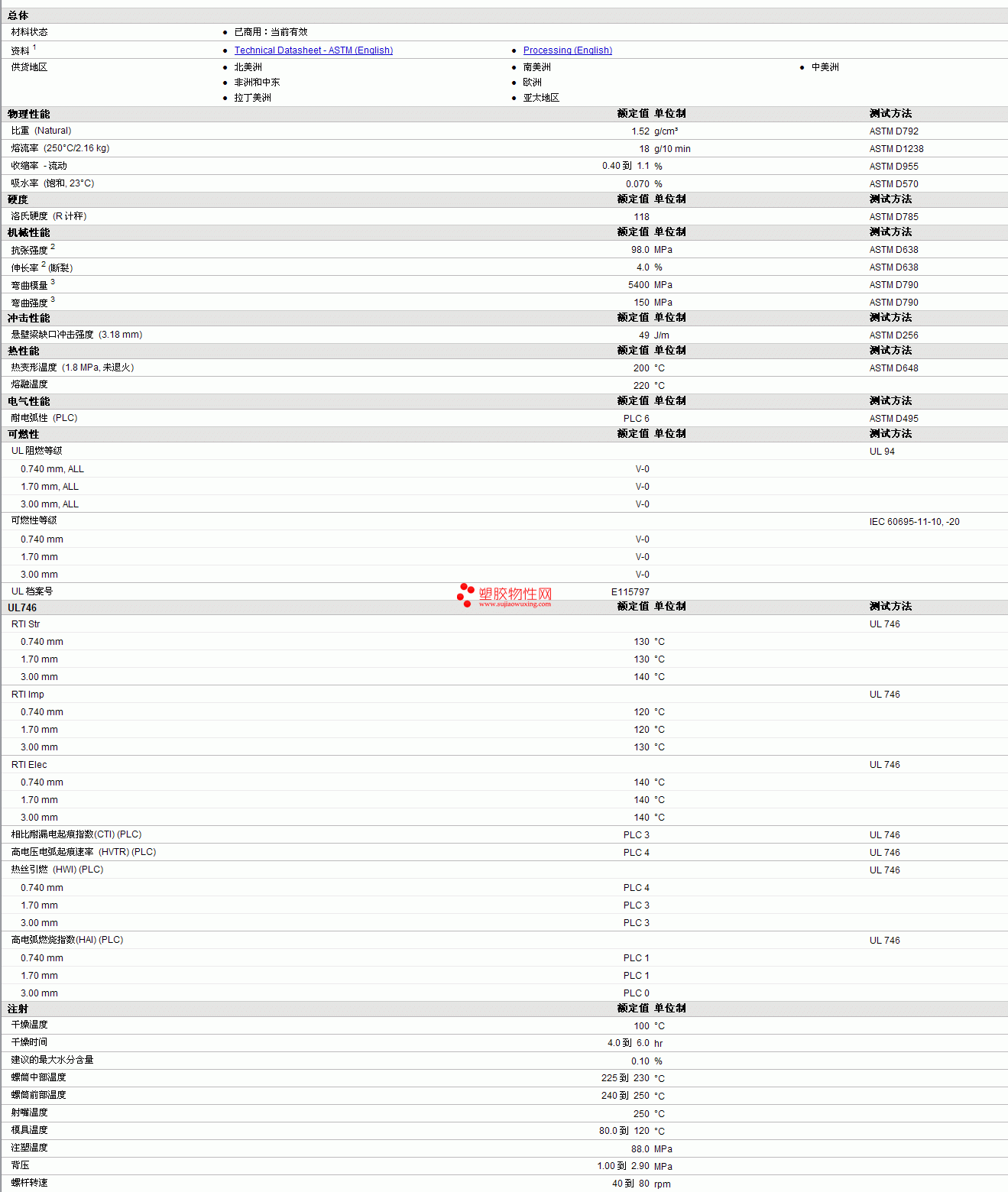 | 收缩率 - 流动 | 0.40 到 1.1 | % | ASTM D955 |