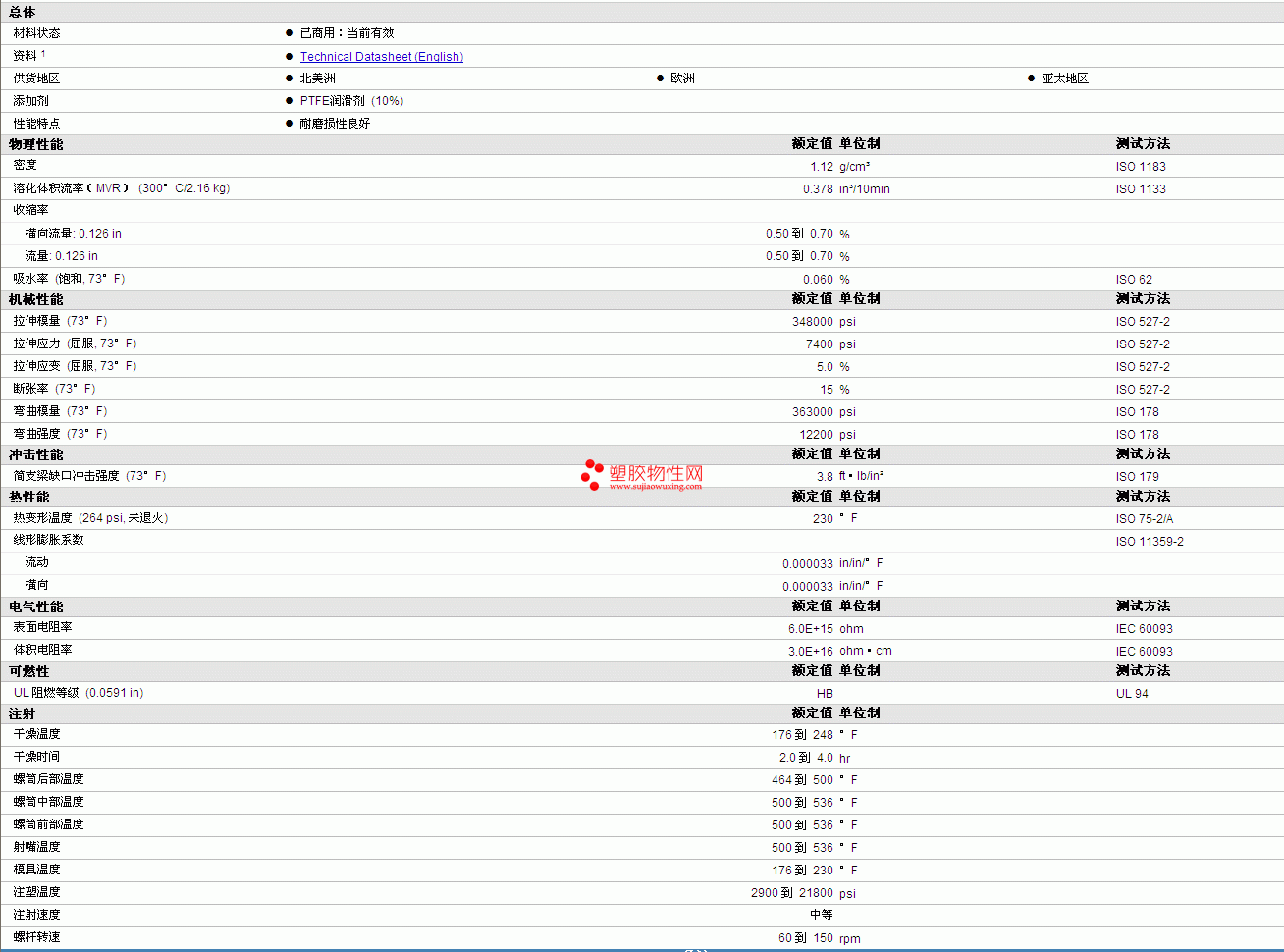 | 溶化体积流率(MVR) (300°C/2.16 kg) | 0.378 | in³/10min | ISO 1133 |
