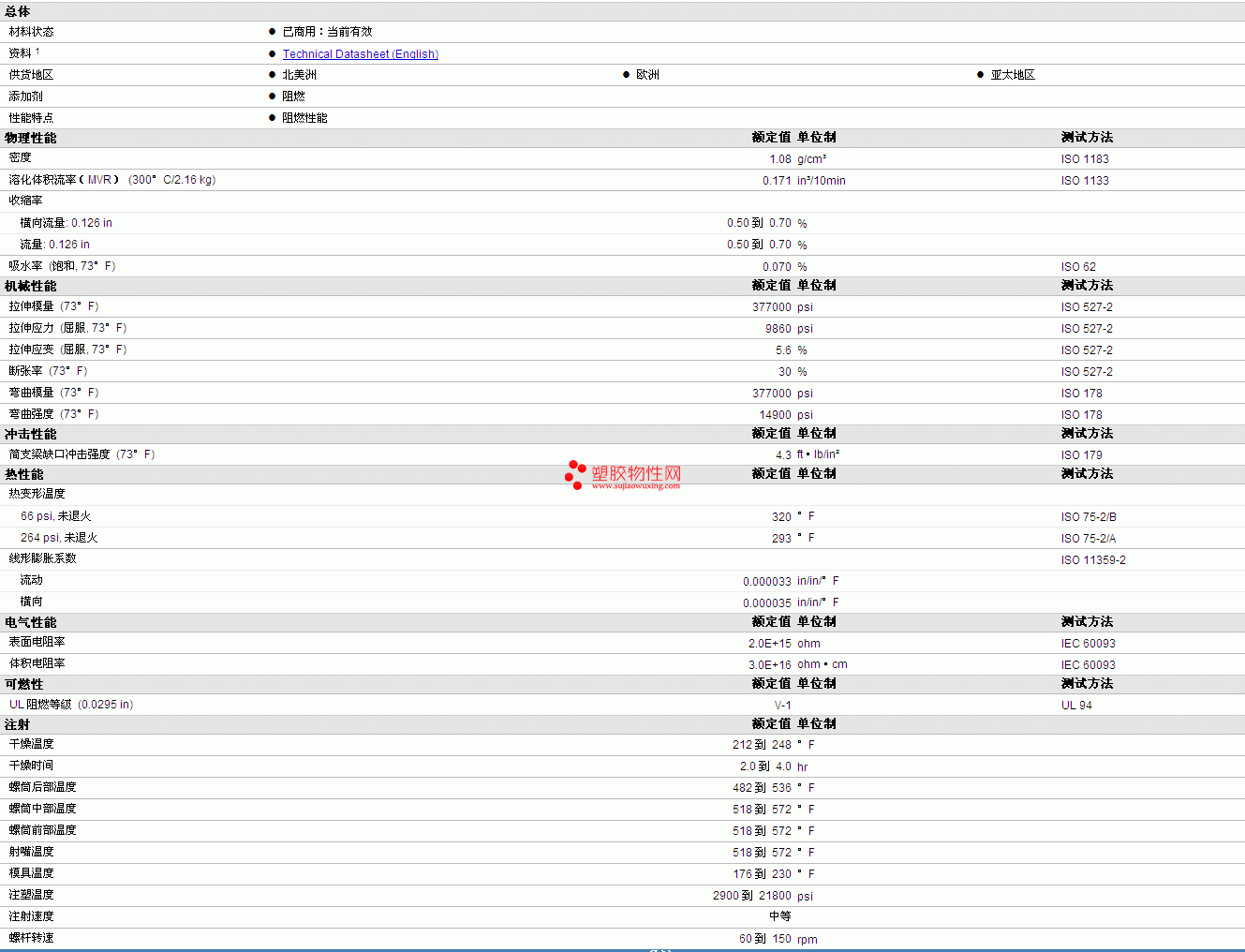 | 溶化体积流率(MVR) (300°C/2.16 kg) | 0.171 | in³/10min | ISO 1133 |