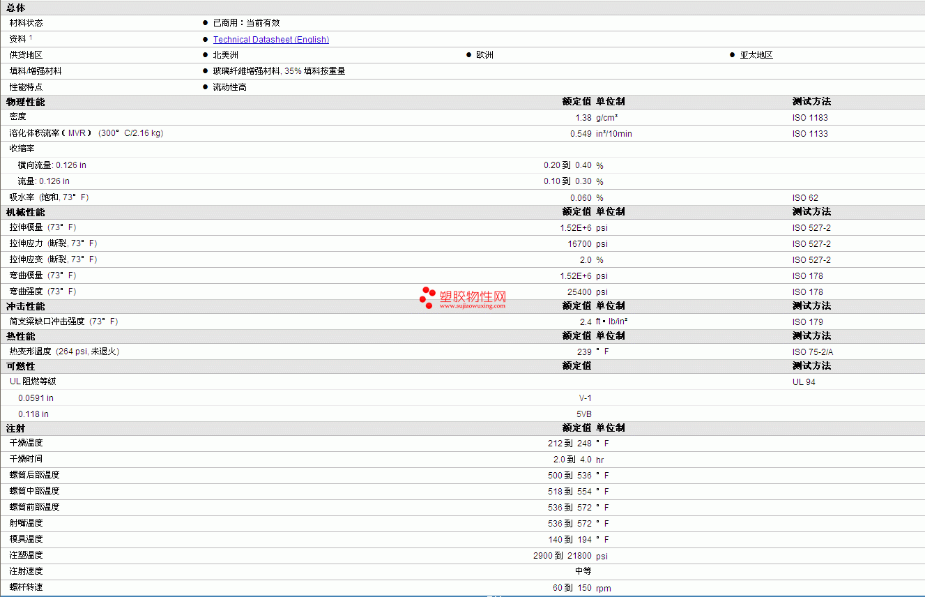 | 溶化体积流率(MVR) (300°C/2.16 kg) | 0.549 | in³/10min | ISO 1133 |