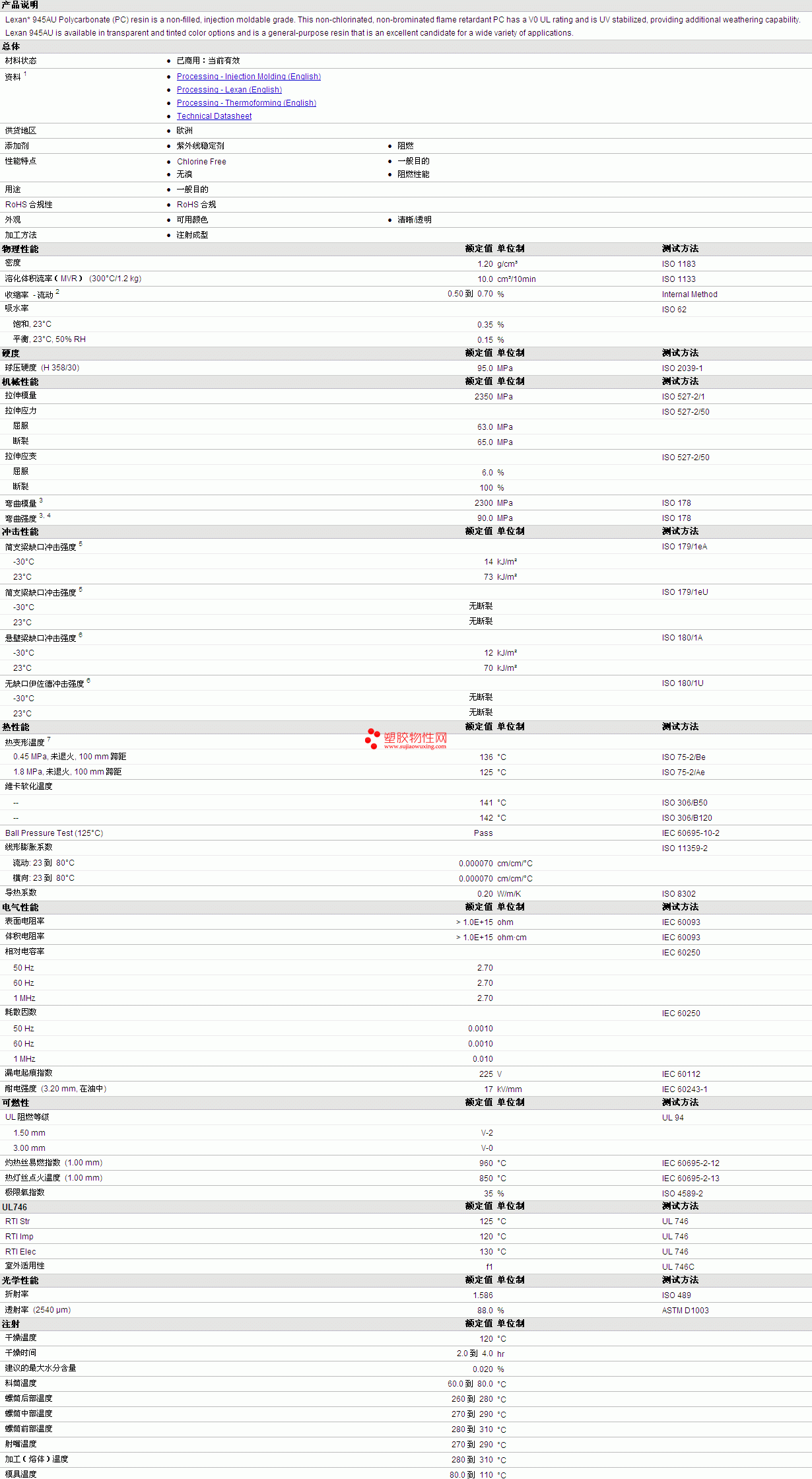 如需LEXAN PC 945AU Resin塑料更多详情,其他塑胶原料物性尽在塑胶物性网,致电咨询或QQ:767320520