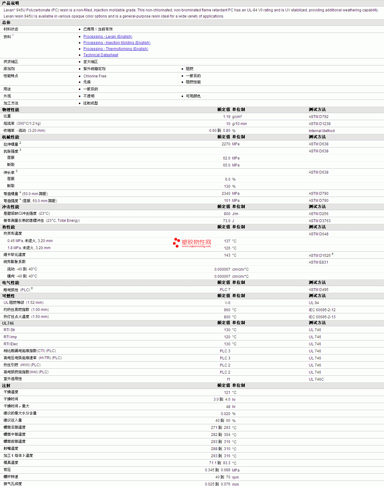 更多LEXAN PC 945U Resin物性表图片,物质安全资料表(MSDS)、材质证明、UL黄卡等,最新行情报价等可来电咨询或QQ:767320520