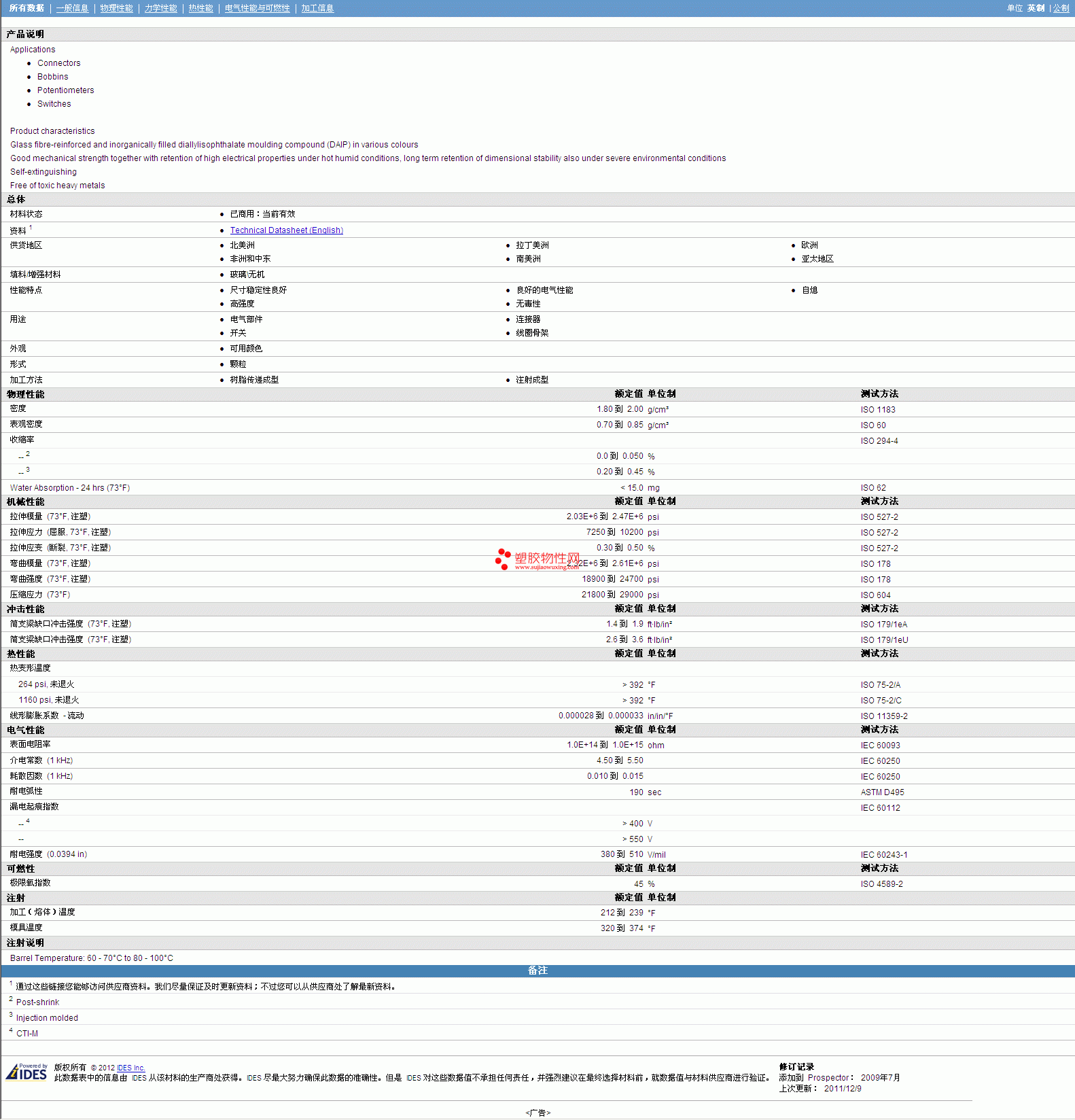 | 密度 | 1.80 到 2.00 | g/cm³ | ISO 1183 |