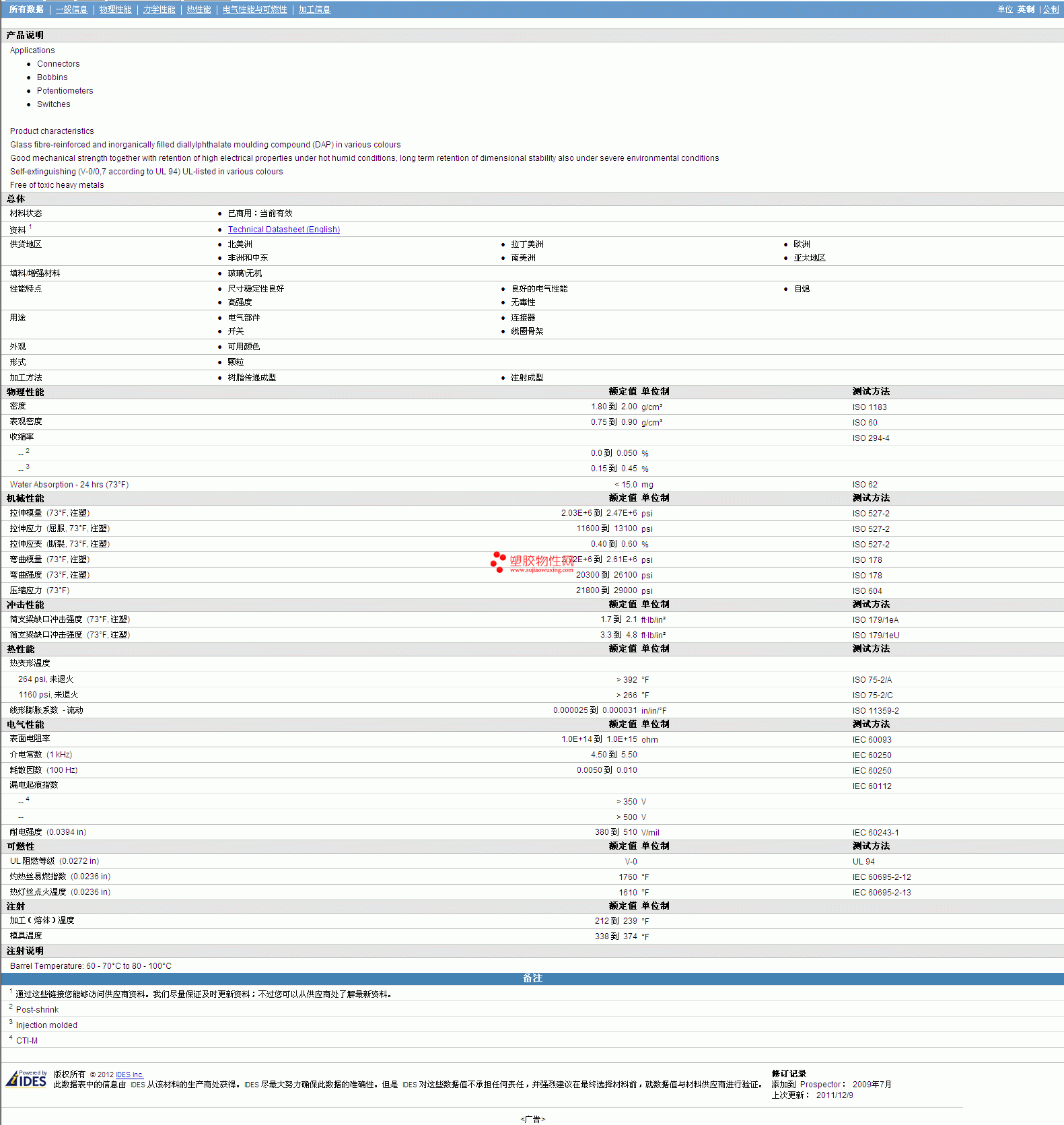 | 密度 | 1.80 到 2.00 | g/cm³ | ISO 1183 |