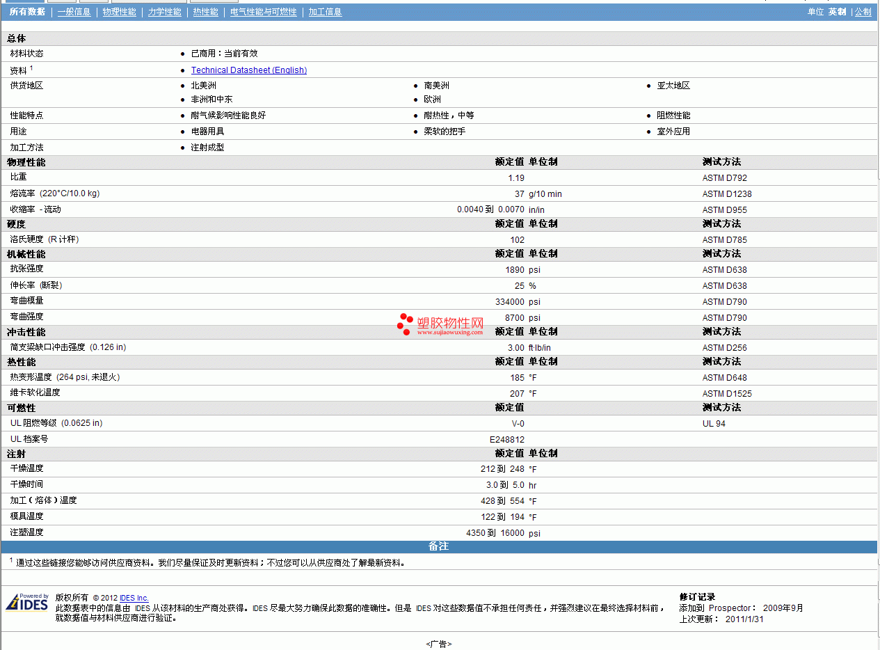 | 收缩率 - 流动 | 0.0040 到 0.0070 | in/in | ASTM D955 |