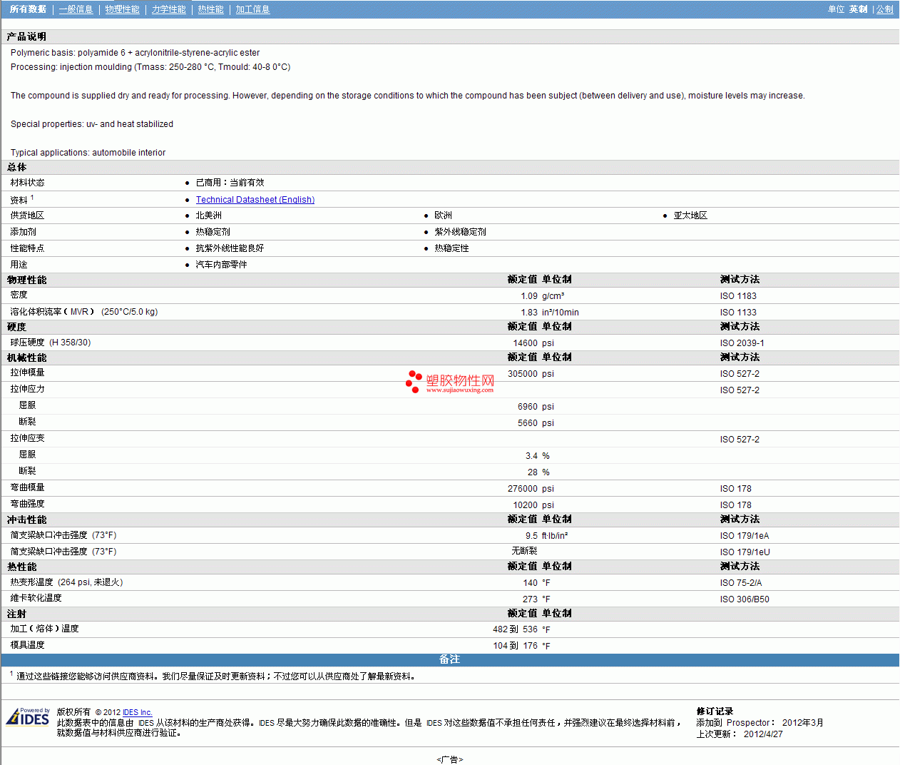 需了解ALTECH PA6 ASA A 1000/221 UV IM物性表更多详情,材质证明、ROHS(SGS)报告、物质安全资料表(MSDS)、UL黄卡等,最新行情报价等可来电咨询:赵先生:13424755533 或QQ:27660005