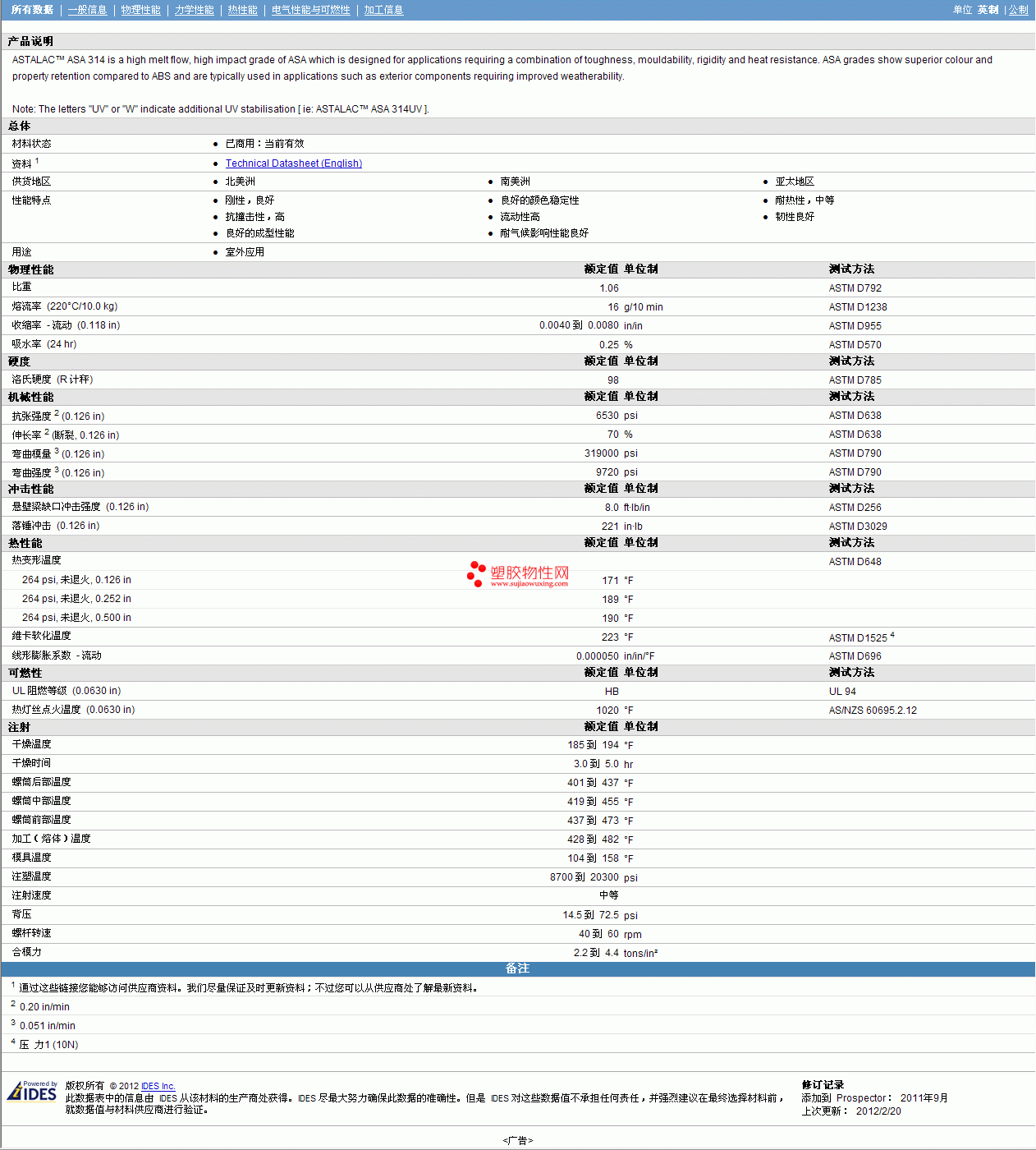 更多ASTALAC ASA 314 物性表报价,图片、材质证明、UL黄卡、物质安全资料表(MSDS)等,最新行情报价等可来电咨询赵先生:13424755533 或QQ:27660005