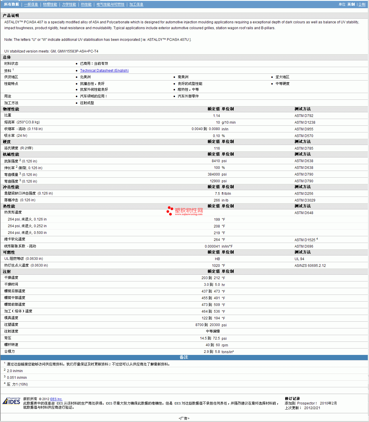 更多ASTALOY PC/ASA 407 物性表报价,图片、材质证明、UL黄卡、物质安全资料表(MSDS)等可来电咨询赵先生:13424755533 或QQ:27660005