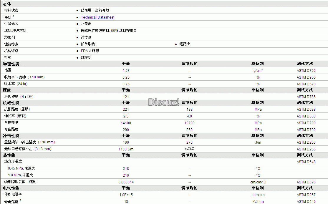 HiFill PA6 GF50 LE物性表详细内容如图