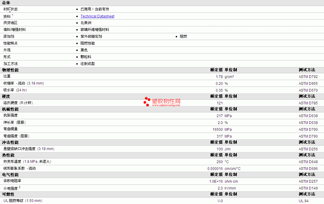 HiFill FR PA6/6 GF50 FR UV X BK物性表详细内容如图