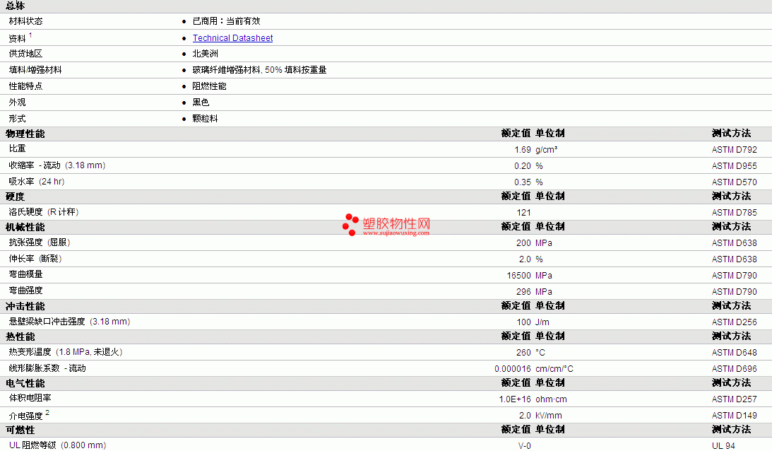 HiFill FR PA6/6 GF50 FR BK物性表详情如图所示